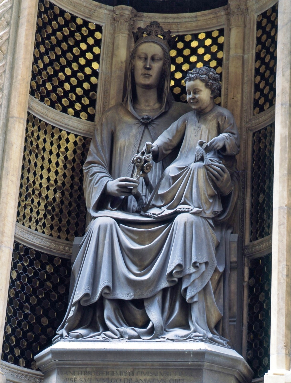 Gruppo marmoreo raffigurante la Madonna seduta in trono con il Bambino in braccio, che gioca con il mazzolino di rose canine che la Vergine stringe nella mano destra. L'Infante tiene delicatamente per un'ala un uccellino che poggia sulla sua gamba