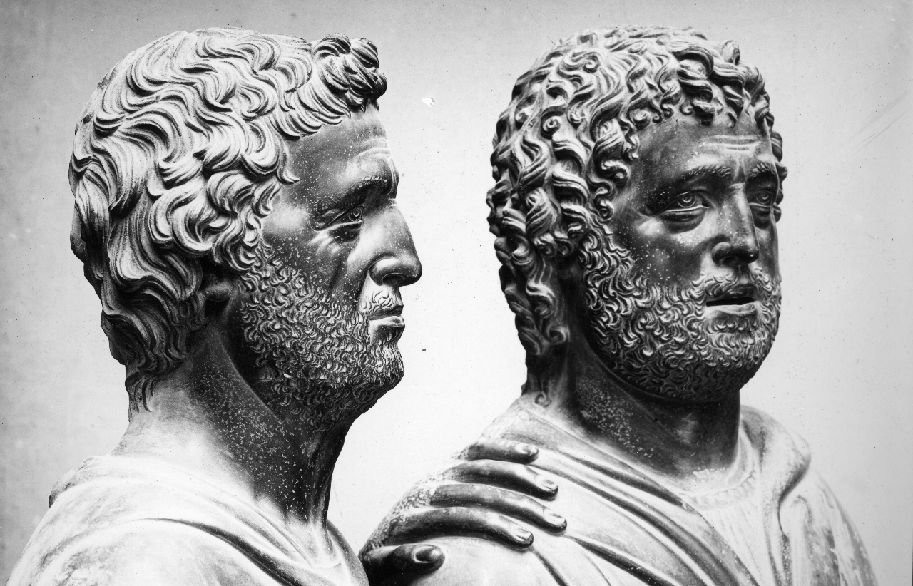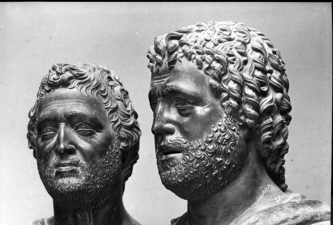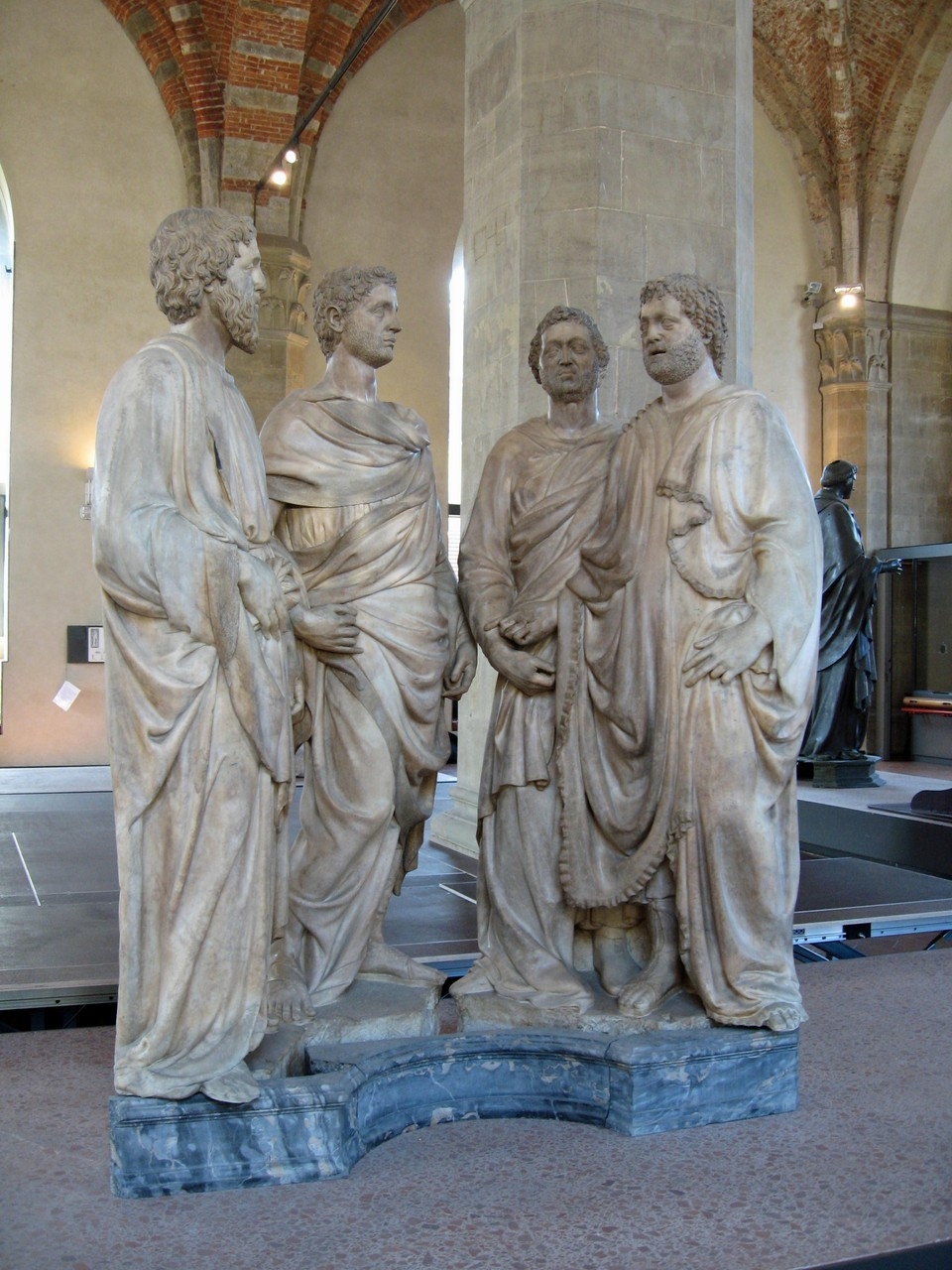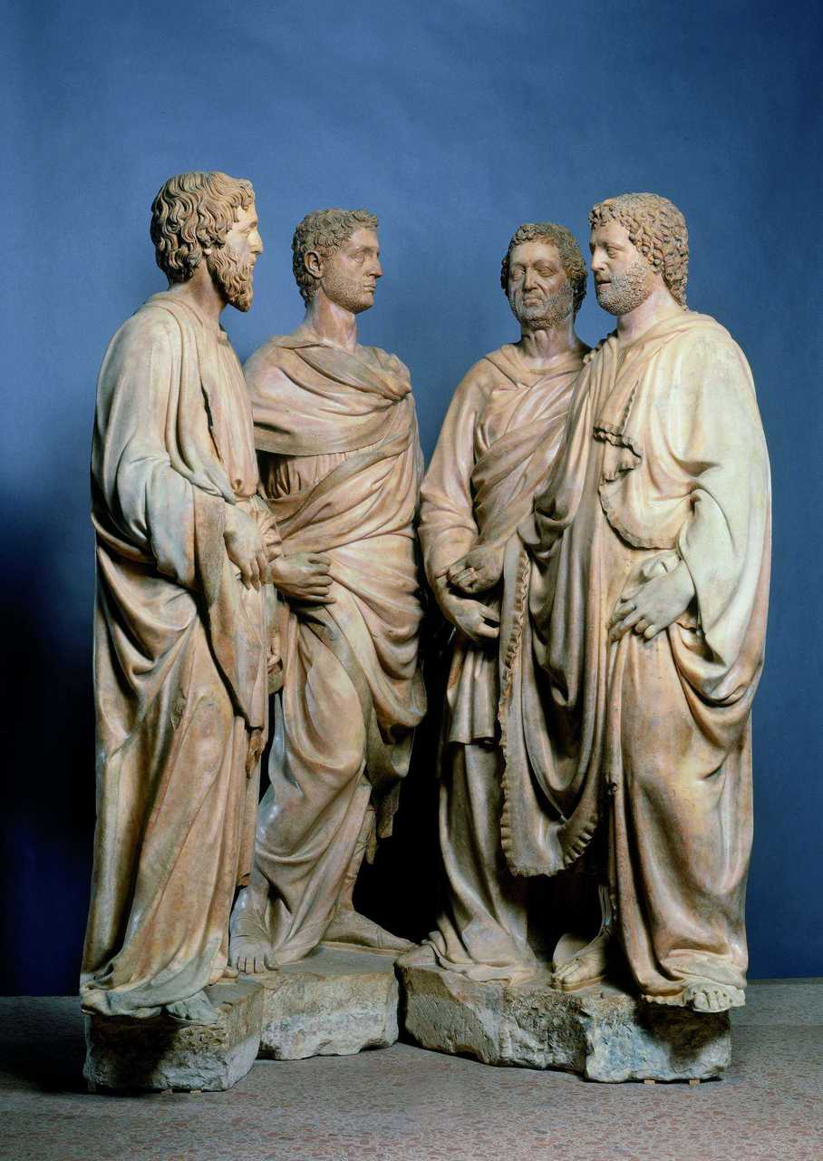 Gruppo scultoreo in marmo. Le quattro figure, disposte a semicerchio, sono rialzate su basamenti delimitati da una cornice a sagoma mistilinea in marmo grigio venato. L'abbigliamento all'antica, i volti pacati e le acconciature di barba e capelli rimandano chiaramente alla statuaria di epoca romana