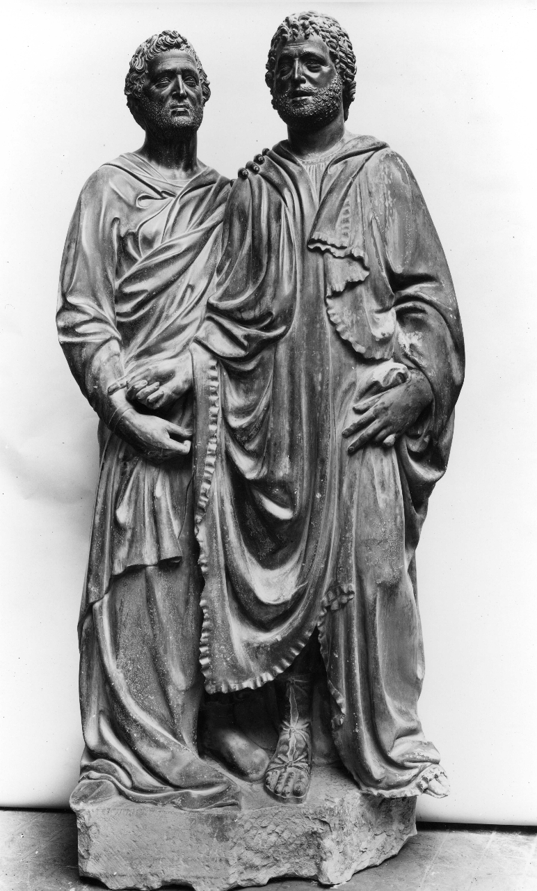 - NOTIZIE STORICO CRITICHE Il gruppo scultoreo non documentato, è stato concordemente attribuito a Nanni di Banco dalla critica, lungamente dibattuta è la datazione: Reymond e Schlosser pongono i Santi quattro coronati tra la statua di San Filippo e quella di Sant'Eligio ascritti al 1408; il Wundram data il gruppo scultoreo al 1413-1415, come anche il Planiscig che, però, lo pone stilisticamente dopo il Sant'Eligio; agli anni 1411-1414, periodo in cui Nanni di Banco fu eletto tra i consoli dell'Arte dei Maestri in Pietra e Legname; il Vaccarino, invece, sostiene che lo scultore eseguì il San Filippo ed i Santi quattro coronati a fasi alterne fino al 1413, anno in cui concluse il gruppo scultoreo in esame: Seymour, Wulff e Schubring lo datano al 1415. La critica ha anche discusso la successione cronologica delle statue stesse che compongono il gruppo. Secondo Wundram le prime due statue a destra fanno parte di uno stesso blocco marmoreo e sono anteriori rispetto alla altre due. Particolarmente interessante ci sembra la discussione riguardo al giovane Santo coronato posto nella parte più interna della nicchia. Il Wundram vi ha visto una ripresa del movimento del panneggio del David in marmo di Donatello. Il Lanyi ed il Vaccarino invece pongono la statua stilisticamente tra l'Isaia del duomo prima opera documentata dellartista, ed il San Filippo d'Orsanmichele. La Brunetti ipotizza che in origine la statua del giovane Santo coronato fosse stata eseguita come profeta da affiancare all'Isaia del duomo, ipotesi rifiutata dal Wundram. Bergstein (2000; 2012) data il gruppo tra il 1409 e il 1416-1417