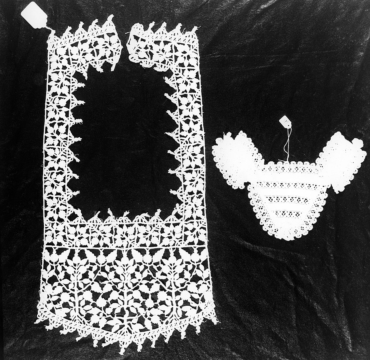 - NOTIZIE STORICO CRITICHE Il crochet o uncinetto indica un tipo di lavoro eseguito con un apposito ago uncinato, diffuso nel XIX secolo in Irlanda (Guipure irlandese), e fatto conoscere in Italia grazie alla lavorazioni importate sul lago Trasimeno dalla marchesa Guglielmi. Il lavoro facile nell'esecuzione si diffuse rapidamente in Italia e grazie ai disegni forniti dalle riviste dedicate al ricamo poteva essere lavorato a casa senza nessuna difficoltà. La consistenza ricordava l'effetto di alcuni tipi di merletti e la tecnica permetteva il recupero di motivi geometrici legati alla tradizione del ricamo, ma anche di quelli floreali, provenienti dai riferimenti alle "Rose d'Irlanda" della Guipure. Si ritiene che l'esemplare sia di esecuzione casalinga per una veste lunga da neonato, collocabile agli inizi del XX secolo (Eleganza civetterie)