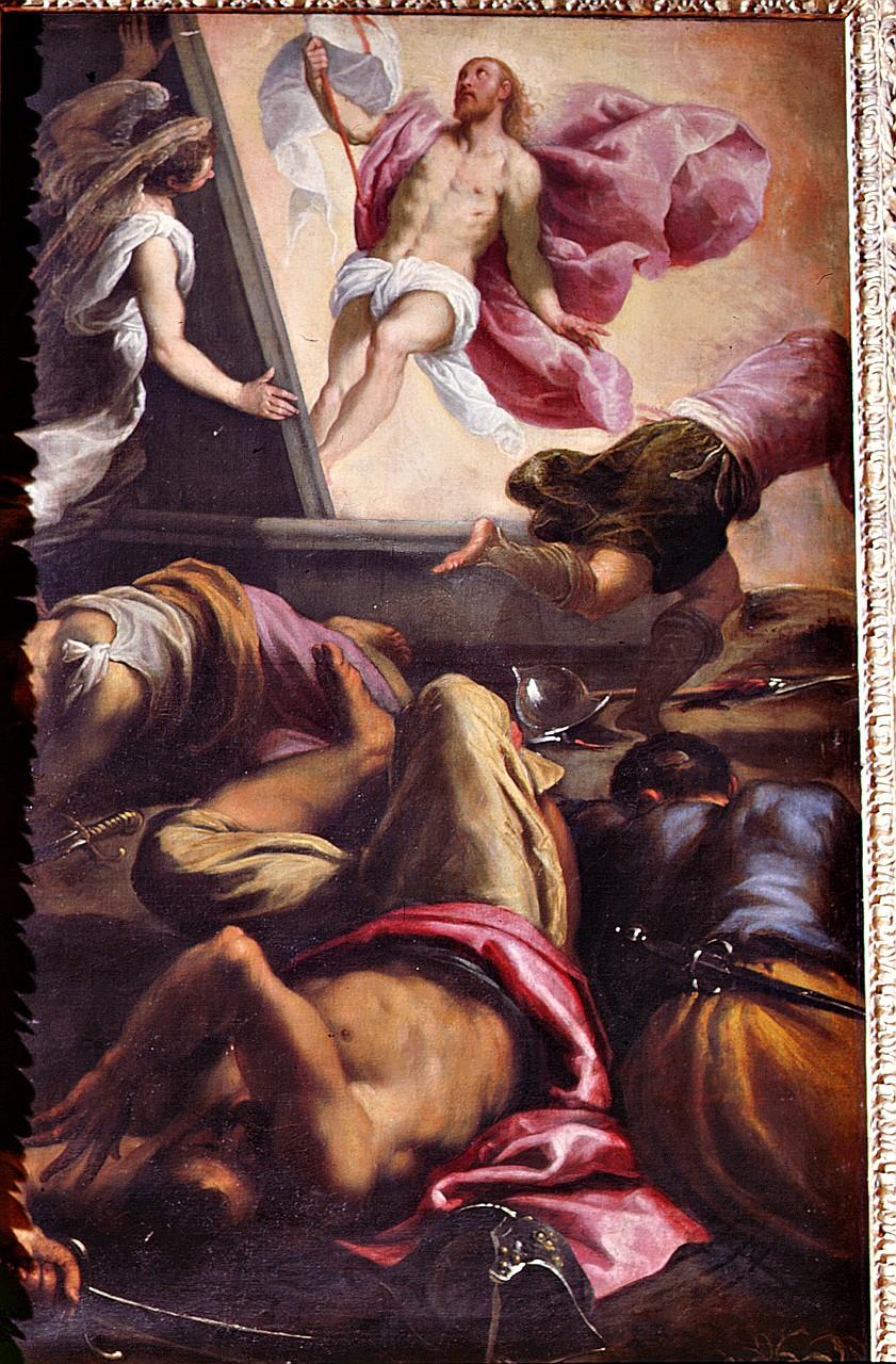 Personaggi: Cristo. Figure: angelo. Figure maschili: soldati. Abbigliamento: all'antica. Attributi: (Cristo) vessillo della Resurrezione. Paesaggi: cielo; nuvole. Architetture: sepolcro. Oggetti: spade; elmi; drappi