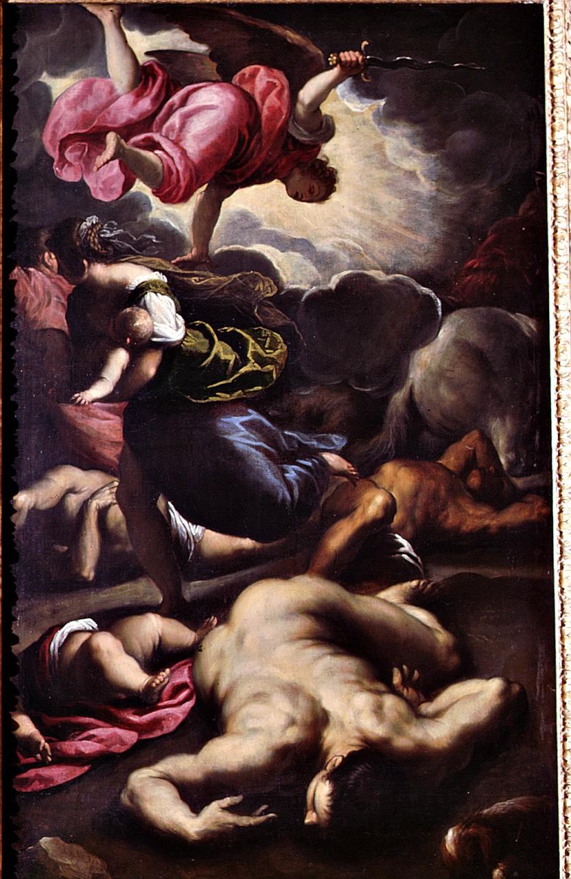 Soggetti sacri. Figure: angelo. Figure maschili: primogeniti. Figure femminili: giovane donna. Abbigliamento: all'antica. Paesaggi: cielo; nuvole; rocce. Oggetti: spada; drappi. Animali: cavallo; cane
