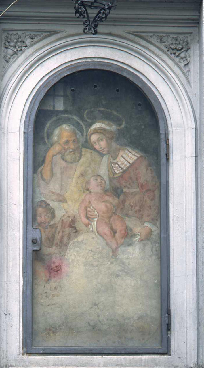 - NOTIZIE STORICO CRITICHE Il buono stato di conservazione della struttura ed un certo accademico nitore della linea disegnativa, potrebbe anche far supporre una datazione più tarda. Non sarebbe la prima volta, d'altra parte, che l'affresco di un tabernacolo venga spostato dalla originaria ubicazione e gli si costruisca attorno una nuova struttura architettonica che tende a riprodurre l'antico schema. D'altra parte, del tabernacolo non fa cenno neanche il Carocci nelle sue schede manoscritte