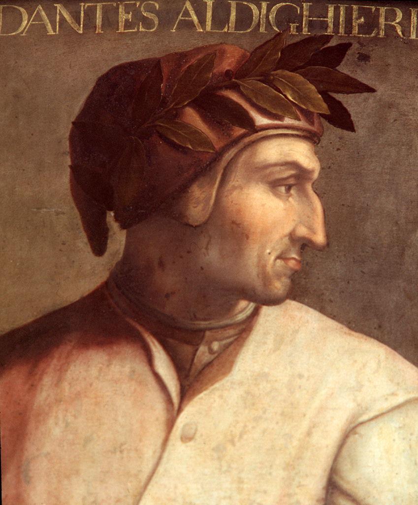 Ritratti. Personaggi: Dante Alighieri. Abbigliamento: veste; cappuccio; Oggetti: corona d'alloro