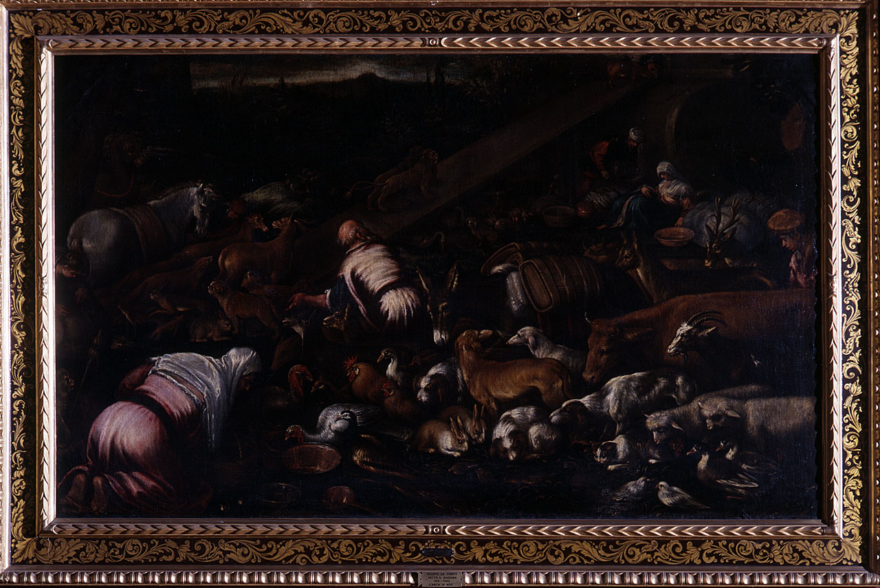 - NOTIZIE STORICO CRITICHE I due quadri con "Gli animali salgono sull'arca di Noe'" e "La fine del diluvio" sono con ogni probabilita' pendant appartenenti ad un ciclo di soggetti biblici piu' volte ripetuto dai Bassano e dalla loro bottega. L'Arslan afferma che i prototipi perduti del ciclo sul Diluvio sono stati eseguiti dai Bassano, probabilmente da Jacopo nel 1574 ca. Avvicinabili stilisticamente ed iconograficamente a quelli dello Stibbert sono i seguenti dipinti dei Bassano e della loro bottega: "L'entrata nell'arca" di Grenoble, "L'entrata nell'arca" del Louvre, "I figli di Noe' fabbricano capanne" alla Walker Art Gallery di Liverpool, "La fabbrica dell'arca", "L'entrata degli animali", "Il diluvio", "Il sacrificio di Noe'" (corrispondente alla "Fine del diluvio" dello Stibbert) della Galleria di Kromeriz (Cecoslovacchia). Quest'ultima serie completa e' firmata da Jacopo anche se vi sono interventi di bottega. I due quadri dello Stibbert non differiscono da quelli ora citati se non per alcuni lievi particolari: per esempio nella "Fine del Diluvio" dello Stibbert compare l'arcobaleno nel cielo. Interessante, secondo l'Arslan, e' la minuziosa osservazione degli animali che Jacopo aveva gia' manifestato in altre opere quali "La fuga in Egitto" di Bassano. Questa attenzione al vero non trova comunque paragone nel Cinquecento veneziano