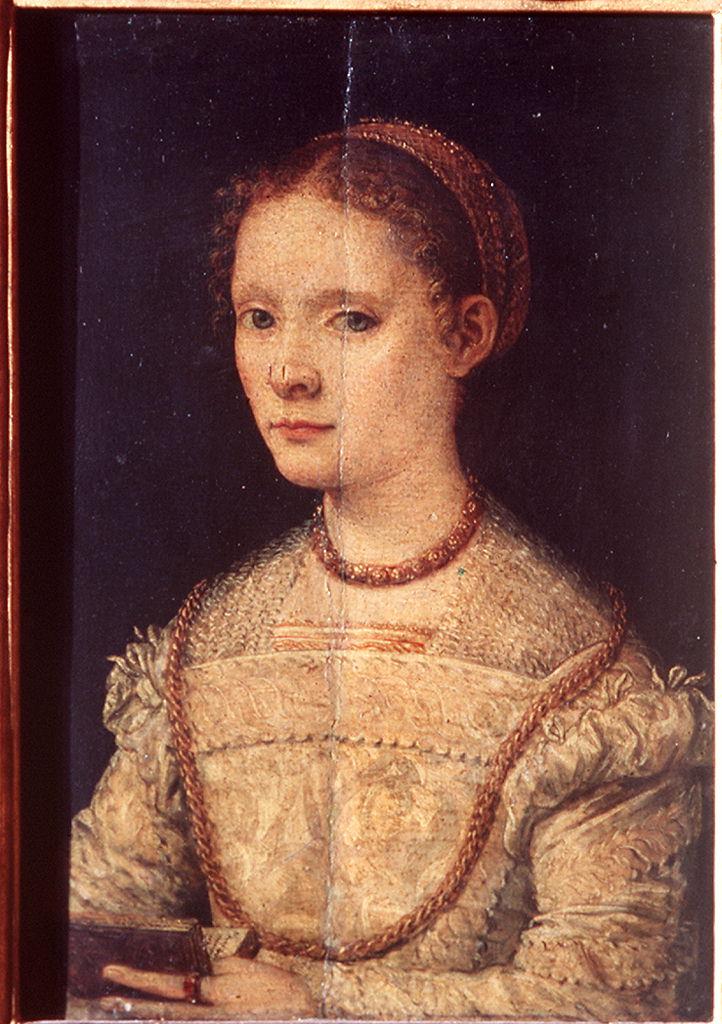 - NOTIZIE STORICO CRITICHE L'iscrizione posta sul retro del piccolo dipinto identifica la giovane con Elena Gaddi e riporta il nome di Maso da San Friano. Questo riferimento compare nelle guide della Galleria degli Uffizi - dove il dipinto entrò alla fine del 1780 - a partire da quella di Zacchiroli del 1783. Nel 1928 il ritratto fu trasferito nella Galleria Palatina ed è citato nel catalogo dello Jahn Rusconi del 1937 come opera di Maso. Il riferimento all'artista è accolto da tutta la critica