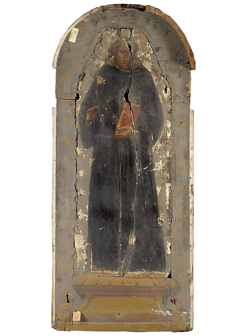 - NOTIZIE STORICO CRITICHE Nella scheda dell'Archivio della Galleria il santo è identificato con Sant'Antonio da Padova; nonostante il cattivo stato di conservazione che ne rende difficile persino la lettura iconografica, sembra tuttavia che il santo raffigurato debba identificarsi con San Nicola da Tolentino, come farebbero supporre il saio agostiniano di colore nero stretto da una cinta di cuoio e il giglio. Il dipinto è datato nella scheda del 1987 (cfr. sezione vecchie schede) al 1380/ 1390. Pur con l'evidente difficoltà di lettura mi sembra che il dipinto debba essere riferito ad un'epoca più tarda, la prima metà del Quattrocento, tra terzo e quinto decennio. Nella figura si riscontrano analogie molto strette con l'omonimo santo raffigurato nel 1445 da Bicci di Lorenzo nella tavola della peste per la chiesa degli Agostiniani di Empoli; non mi sembra fuori luogo una attribuzione alla operosissima bottega di questo maestro. La tavola originale, facente forse parte di un polittico, si distingue infatti ancora le sua forma cuspidata, è stata inserita in una aggiunta centinata decorata da stelle e da un piedistallo sul quale si finge posi l'effigie del santo. Questa aggiunta si data forse nel XVIII secolo, epoca nella quale, secondo un uso abbastanza comune per ragioni di moda e insieme di devozione, il polittico venne smembrato