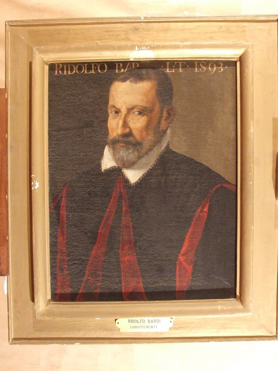- NOTIZIE STORICO CRITICHE Nel 1596 il Luogotenente Francesco Maria Ricasoli diede incarico al provveditore dell'Accademia delle Arti del Disegno, Scipione Stradano, di far eseguire i ritratti dei suoi predecessori, da alcuni dei pittori accademici, ispirandosi all'iconografia che caratterizzava la serie gioviana delle collezioni medicee avviata nel 1552 su idea di Cosimo I, con le copie dai ritratti della collezione di Paolo Giovio, fatte da Cristofano dell'Altissimo. Dal mese di giugno ad ottobre del 1596 furono eseguiti 14 ritratti di luogotenenti compreso quello del Ricasoli.Queste le notizie che riporta Cavallucci, rifacendosi ad un libro di ricordi dal 1593 al 1602 ancora conservato presso l'Archivio di Stato, nel fondo dell'Accademia. A questi, prosegue il Cavallucci, si aggiunsero quello di Giovanni de' Medici, protettore dell'Accademia, eseguito dal Cigoli e quello del luogotenente successore del Ridolfi, Pietro di Matteo Strozzi, eseguito da Niccolò Betti. Di altri tredici ritratti dei Luogotenenti che si susseguirono nel Seicento e Settecento, Cavallucci scrive di non aver trovato notizia nelle filze dell'Accademia. I ritratti dei Luogotenenti si conservarono nelle diverse sedi dell'Accademia, prima in quella di Cestello, abbandonata nel 1626, poi in quella della Crocetta: qui sono inventariati, nella stanza della residenza, 26ritratti di luogotenenti nel 1705 (Pacini p. 215) e 30 nel 1778 (Pacini p. 247). Con l'accorpamento all'Accademia di Belle Arti, avvenuto a seguito della riforma leopoldina del 1784, andarono ad arredare ambienti delle sedi successive, dall'Ospedale di San Matteo all'ex convento di Santa Caterina divenuto archivio e biblioteca dell'Accademia (M. Mosco in Gli Uffizi, p. 706). Il 15 luglio 1853, come risulta dal loro inserimento nel Supplemento all'inventario del catalogo generale della Galleria degli Uffizi, i ritratti dei luogotenenti, in un gruppo di 481 opere,"pervennero" alla Galleria degli Uffizi dalla Accademia di Belle Arti, delle quali Luca Bourbon del Monte ricopriva rispettivamente l'incarico di direttore e presidente. Ad eccezione di questo inserimento nel supplemento dell'inventario del 1825,avvenuto nel 1853 non si hanno notizie di un passaggio formale dei dipinti all Gallerie. La serie dei ritratti non è pervenuta integra, essendovi alcuni dispersi, come i ritratti di Pietro Strozzi e Baccio Valori, e quello di Simone Guiducci, quest'ultimo presente nell'inventario del 1853. I dipinti della prima serie hanno in comune la scritta in giallo con il nome del personaggio ritratto, uso che non sempre fu seguito nella serie successiva al Ricasoli, creando delle difficoltà di identificazione che potrebbero essere sciolte solo attraverso un'indagine iconografica. I ritratti hanno misure simili: le tele di alcuni di essi risultano ritagliate e in taluni casi ridotte anche di diversi centimetri. Tracce di bolli in ceralacca, più o meno leggibili ma al momento non identificabili, sono presenti sulla tela, nello spessore interno alla cornice, di 12 ritratti (2409, 2410,2413, 2426, 2428, 2438, 2989, 2419, 2443, 2420, 2425), ascrivibili alla serie del 1596 ma anche ad epoca successiva, fino, almeno, alla metà del Seicento. Sono inseriti in cornici a cassetta o a salvadora dipinte in giallo, in alcuni casi dorate e nella maggior parte decorate a porporina.I ritratti dei Luogotenenti, nel numero di 27, dopo diversi passaggi all'interno dei depositi delle Gallerie, sono stati depositati dalle Gallerie Fiorentine presso la sede attuale dell'Accademia delle Arti del Disegno, nel Palazzo dell'Arte dei Beccai, nell'ottobre del 2004.Ad essi si aggiungono sei ritratti di presidenti Otto-Novecenteschi, di proprietà dell'Accademia. Il dipinto ritrae Ridolfo Bardi (1533-1602) che fu luogotenente dell'Accademia dal 1593 al 1595 (Zangheri). Il ritratto, come sappiamo dal libro di ricordi del Provveditore conservato nel fondo dell'Accademia presso l'Archivio di Stato, fu realizzato da Niccolò Betti, nel 1596 su incarico del suo successore, il luogotenente Francesco Maria Ricasoli