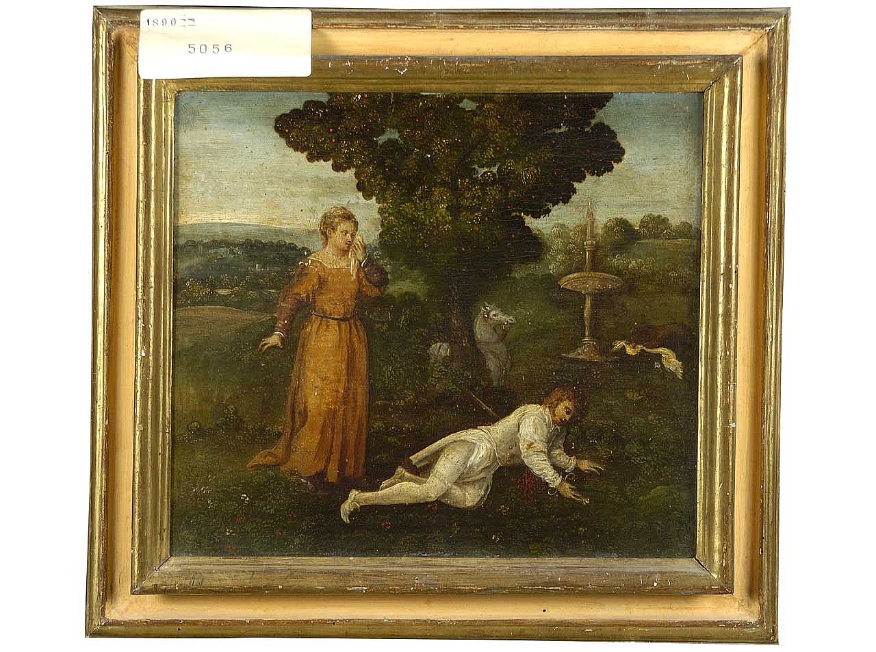 - NOTIZIE STORICO CRITICHE Il dipinto reca sul retro una attribuzione evidentemente poco attendibile a Giorgione. Con la medesima mi sembra da identificare con il dipinto citato nell'inventario del 1713 redatto alla morte del gran principe Ferdinando de' Medici "la favola di Piramo e Tisbe, che sta in atto di piangere vestita di rosso, e Piramo morto in terra con spada nel petto" alto soldi 9 largo mezzo braccio. Nella scheda di catalogo OA del 1987 redatta da M. Triarico (cfr. vecchie schede) il dipinto riferito alla seconda metà del Cinquecento portava un accostamento alla pittura di Andrea Schiavone. Si tratta di una tavoletta piacevolmente descrittiva, nel tono cortese e bucolico della narrazione del soggetto mitologico trasposto in una ambientazione contemporanea. Il dipinto può essere considerato opera di un artista di levatura provinciale, come dimostrano alcune ingenuità spaziali, forse legato alla bottega del Veronese, poco oltre la metà del secolo