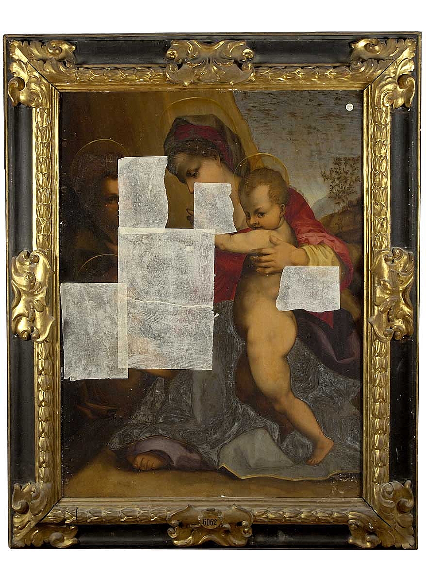 - NOTIZIE STORICO CRITICHE Esistono numerose copie della Madonna Wallace d'Andrea del Sarto; la copia in esame è di mediocre qualità. Ci sono varianti nel paesaggio sul fondo, dove non è presente la figura di San Francesco d'Assisi in preghiera. Una variante è rappresentata anche dalle due figure a sinistra che nella presente versione sono santi anziché angeli. Presso i depositi delle Gallerie (inv. 1890/ 8311 è conservata un'altra copia forse seicentesca del dipinto con le stesse caratteristiche iconografiche di quello qui considerato (cfr. scheda OA 0900228525 del 1991). La copia in esame, a parere di chi aggiorna questa scheda, per certe durezze disegnative, si colloca cronologicamente nel terzo quarto del XVI secolo