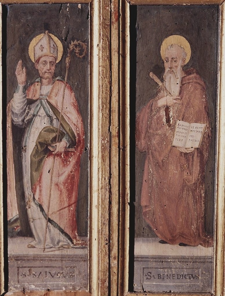 - NOTIZIE STORICO CRITICHE I due piccoli pannelli riuniti in epoca successiva alla loro esecuzione sono attualmente da mettere in relazione con altre due tavolette di misure analoghe raffiguranti la Beata Umiltà e Santa Scolastica, anch'esse conservata presso i depositi della Galleria Palatina. Le tavolette facevano in origine presumibilmente parte di un complesso più ampio, forse sportelli di un altarolo o più facilmente pilastrini di una ancona d'altare. Un cartellino sul retro delle piccole tavole, segnala la loro provenienza, all'epoca delle soppressioni dello stato italiano nel 1866, dalla chiesa del monastero dello Spirito Santo sulla Costa San Giorgio. Le due coppie sono in stato di notevole degrado, con molte lacune e ridipinture, tuttavia stilisticamente possono ricollegarsi alla cosiddetta scuola di San Marco, legata alla figura di Fra Bartolomeo: potrebbe trattarsi di un artista fiorentino ma anche pistoiese. Una datazione successiva al 1520 sembra probabile per queste tavolette ed è confermata anche dalla iconografia benedettina, e in particolare vallombrosana, dei santi raffigurati. Il monastero dello Spirito Santo divenne infatti vallombrosano femminile a partire dal 1520 per decreto di papa Leone X, allorquando vi furono trasferite le monache dal monastero di Santa Verdiana