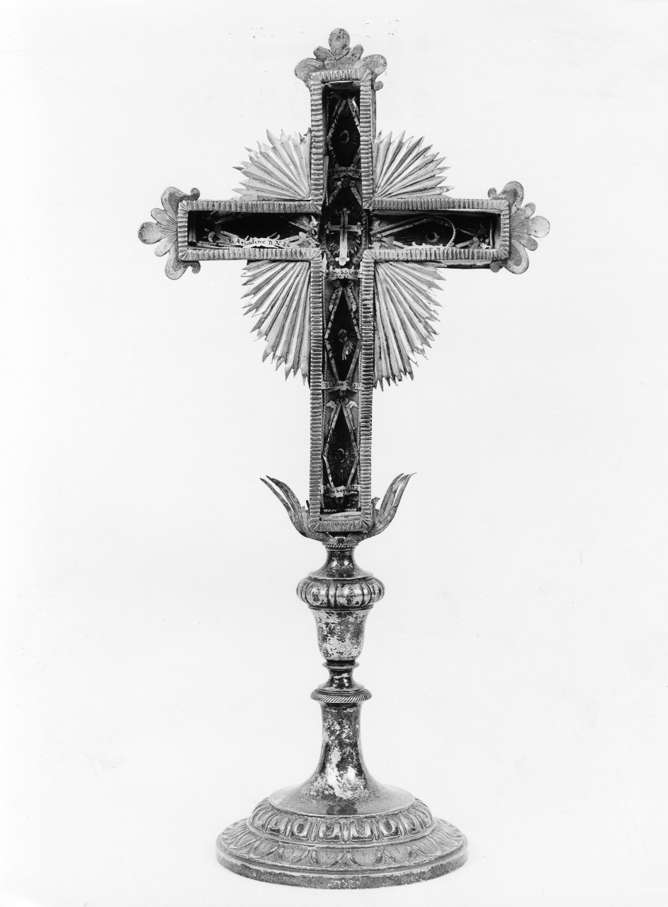 Oggetto assemblato. Il piede circolare a campanula, con strozzatura sul gr adino, sostiene il fusto con nodo principale piriforme. La stauroteca è cr uciforme; alla base ornata da lamine a fiamma, la cornice è a bande, ornat a alla punta dei bracci e sul braccio apicale da un motivo trilobato con v olute, intagliato e sgraffiato. La croce è ornata da una raggera in lamina di rame dorata. All'interno, su una base di tessuto, cinque elementi romb oidali di lamelle di rame dorato, (nei bracci), attorniano una lamina cent rale esagonale sormontata da una corona con festoncino di fiori
