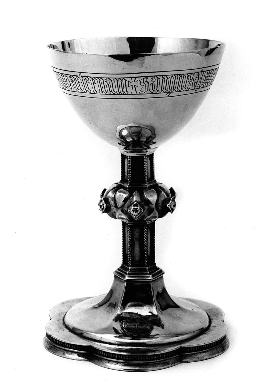 - ISCRIZIONI bordo superiore della coppa - SANGUIS D(OMINI) IESU X(RISTI) CUSTODIAT ANIMAM MEAM IN VITAM AETERNAM - caratteri gotici - a incisione -