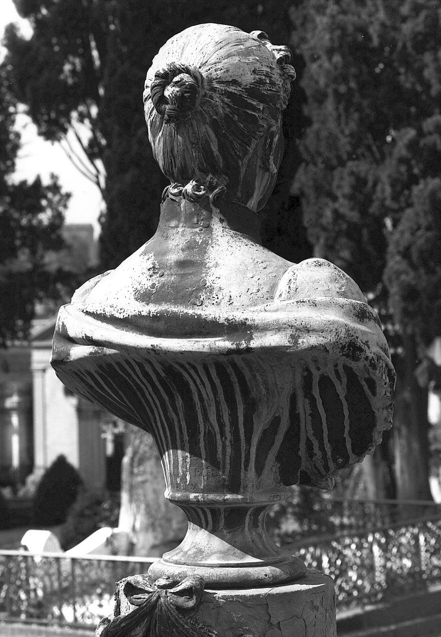 - NOTIZIE STORICO CRITICHE Si tratta del busto ritratto di Orazia Giuntini, moglie del professor Teofilo Caan, anch'egli sepolto nel medesimo cimitero fiorentino (cfr. scheda SBAS FI OA 09303098). Il sobrio abito indossato suggerisce che si tratta di una donna appartenente alla borghesia fiorentina ma dalla vita assai semplice. Purtroppo la lettura formale dell'opera è impedita dall'alto strato di polvere che la ricopre; nonostante ciò notiamo come il modellato mette in evidenza il delicato contorno del volto, i cui caratteri fisionomici corrispondono a quelli di una donna ancora giovane