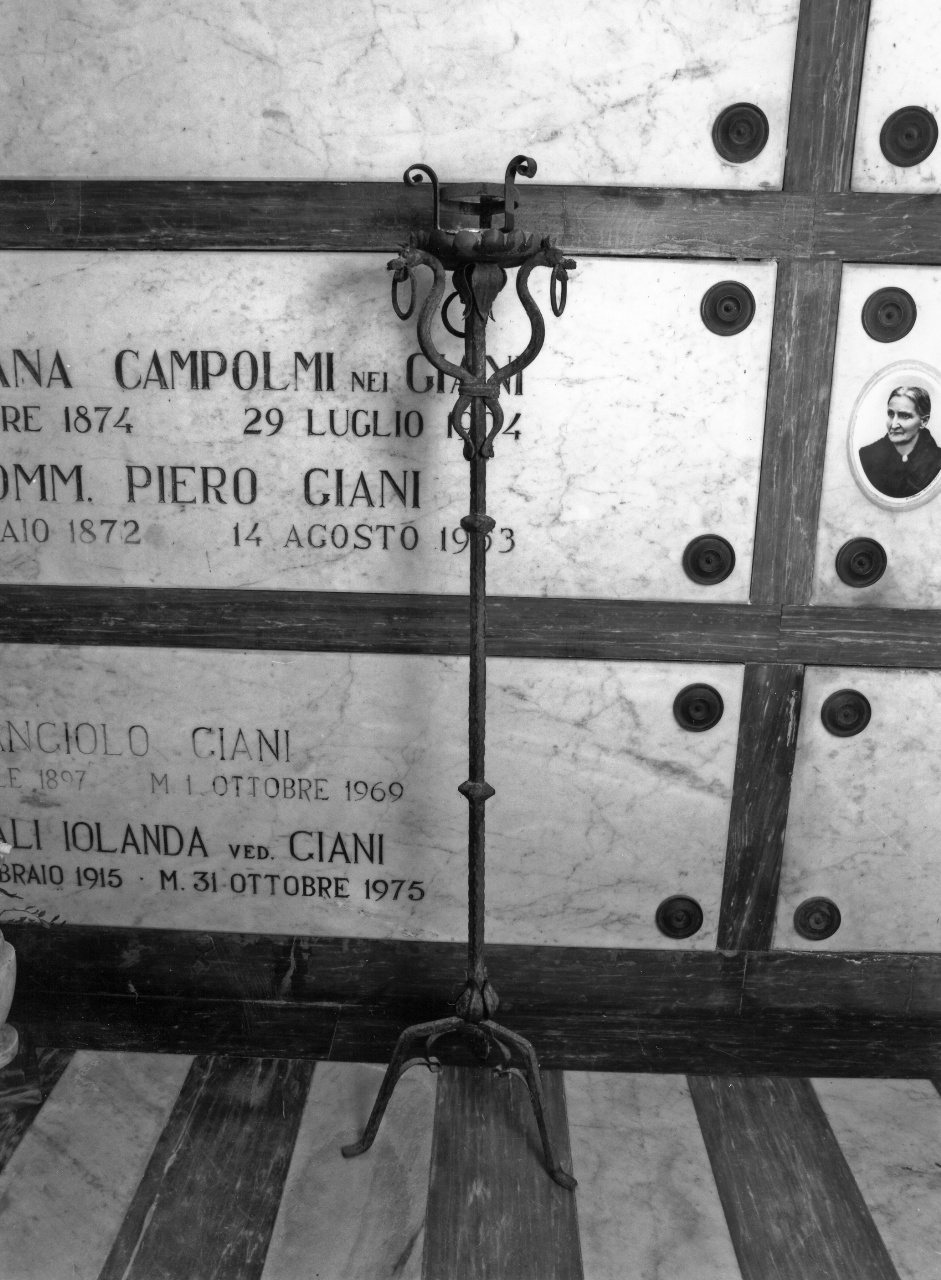 - NOTIZIE STORICO CRITICHE Il candelabro rientra nella classica tipologia del candeliere funebre. La stessa decorazione dei serpenti con testa di drago, simboleggianti il regn o dei morti, conferma che si tratta di un arredo funebre. L'oggetto può es sere datato tra il 1933 ed il 1940, sia per la similitudine con altri cand elieri dell'epoca,sia considerando che la cappella , come risulta da un'is crizione sull'altare, risale al 1933