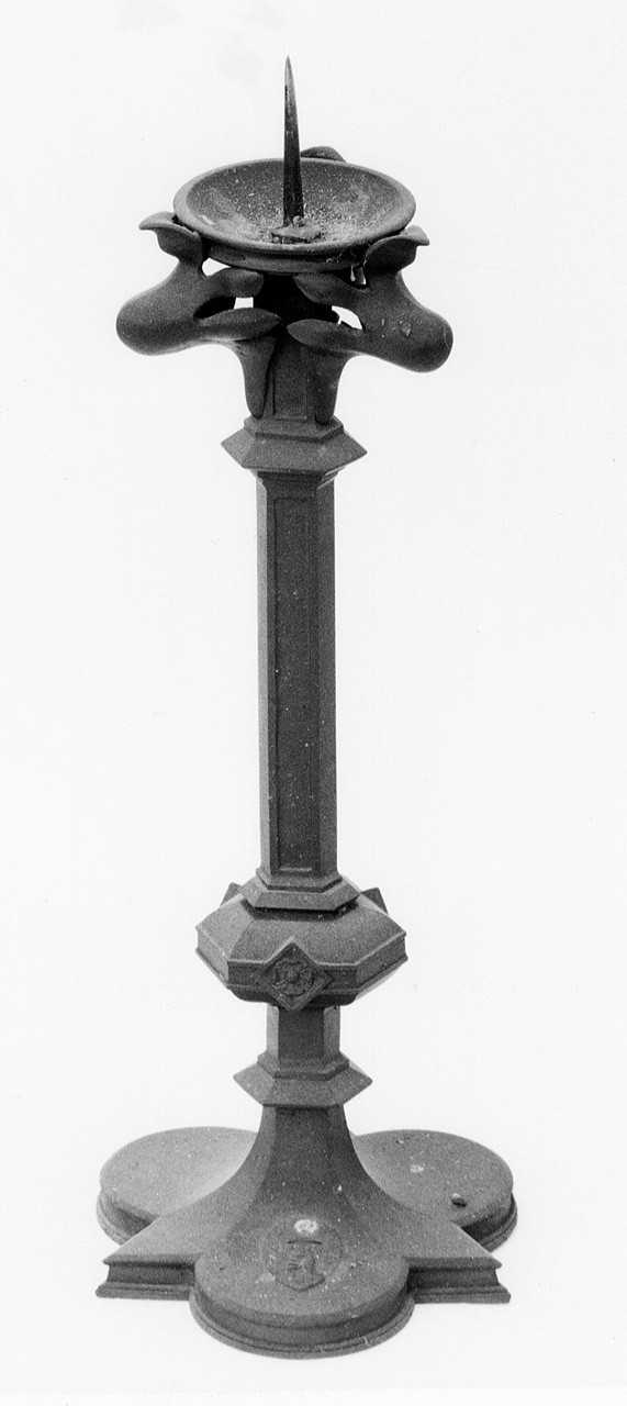 Base a sezione triangolare lobata. Fusto esagonale con specchiature modanate. Nodo schiacciato con tre nodi quadrati con rosette. Bocciolo di tre foglie a gattoni. Piattello liscio. Puntale
