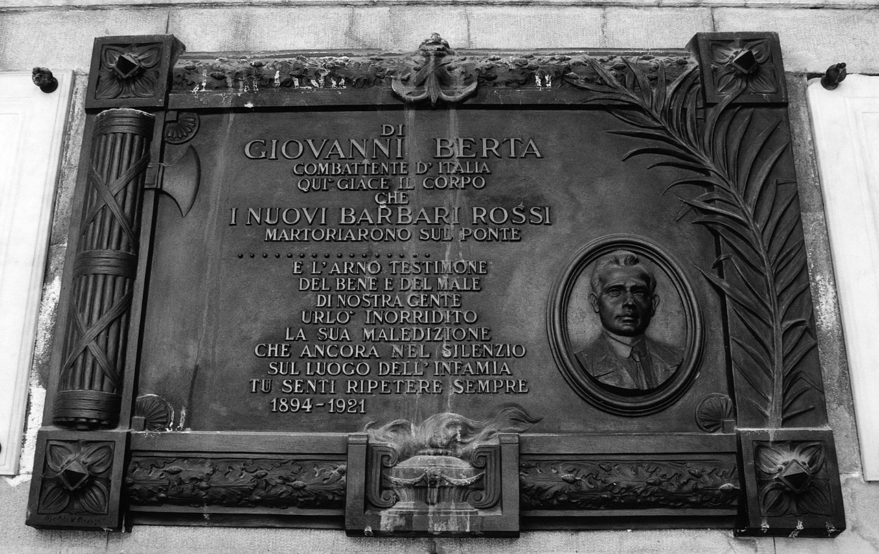 - NOTIZIE STORICO CRITICHE Monumento sepolcrale di Giovanni Berta, figlio di Francesco Berta proprietario della fonderia delle Cure, fabbrica del ferro e del bronzo attiva fin dal XIX secolo (Esposizione regionale, 1888). Giovanni Berta fu ucciso il giorno 28 febbraio 1921 sul ponte antecedente all'attuale ponte della Vittoria durante gli scontri fra opposte fazioni politiche. I versi della poesia che è presente nel monumento furono composti da Sam Benelli "poeta marinaio", come si deduce da un ciclostilato datato 28 febbraio 1971, dell'ex direttore della fonderia delle Cure. Lo scritto si trova sulla mensa d'altare della cappella (Ricordo morte, 1971). Sull'autore del monumento non è stato possibile rintracciare alcuna notizia