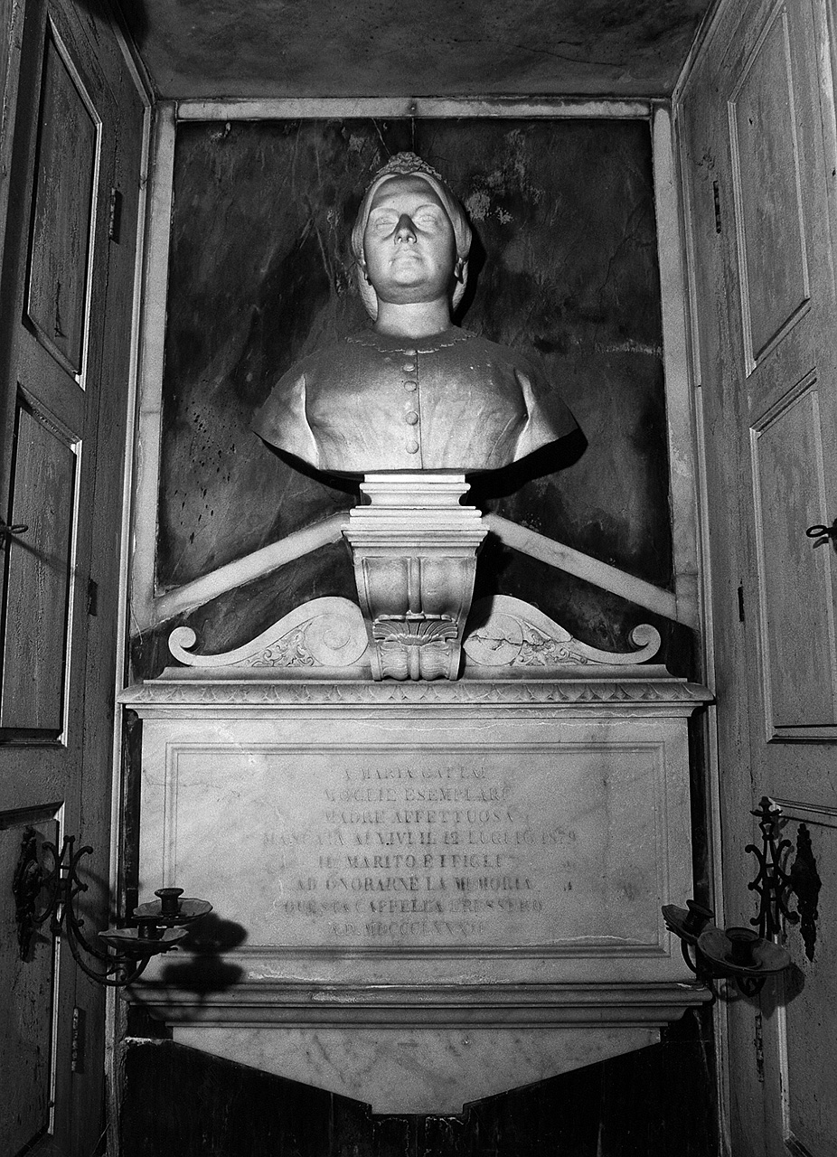 - NOTIZIE STORICO CRITICHE Il monumento a Maria Gattai fu scolpito fra il 1879 (anno di morte della donna) e il 1882 quando i Budini Gattai, di nobile origine fiorentina, fecero costruire la grande cappella di famiglia dall'architetto Giuseppe Boccini di Firenze che per la famiglia restaurò anche il palazzo in piazza SS. Annunziata (Cresti/ Zangheri, Architetti e ingegneri nella Toscana dell'Ottocento, Uniedit,Firenze, 1978, p. 32). Il monumento non è firmato ma può essere attribuito allo scultore di Ravenna Enrico Pazzi, allievo a Firenze di Giovanni Duprè, se lo si confronta con un altro nella cappella Cipriani nel Cimitero delle Porte Sante (scheda OA n. 0900304059) identico per struttura e stilisticamente molto vicino nel modellato del busto. Lo scultore, ormai noto in quegli anni per la statua di Dante in piazza Santa Croce e il Savonarola per il Salone dei Cinquecento (ora nella piazza omonima), eseguì tra gli anni '70 e '80 diversi busti per personaggi illustri (Parini, Alfieri, Foscolo, Leopardi) caratterizzati, come quello della cappella Cipriani e questo di Maria Gattai, da una naturalezza di epressione e da grande verosimiglianza, insolita nei ritratti funerari. Il volto di Maria Gattai è stato reso dallo scultore con particolare attenzione anche alla psicologia del personaggio