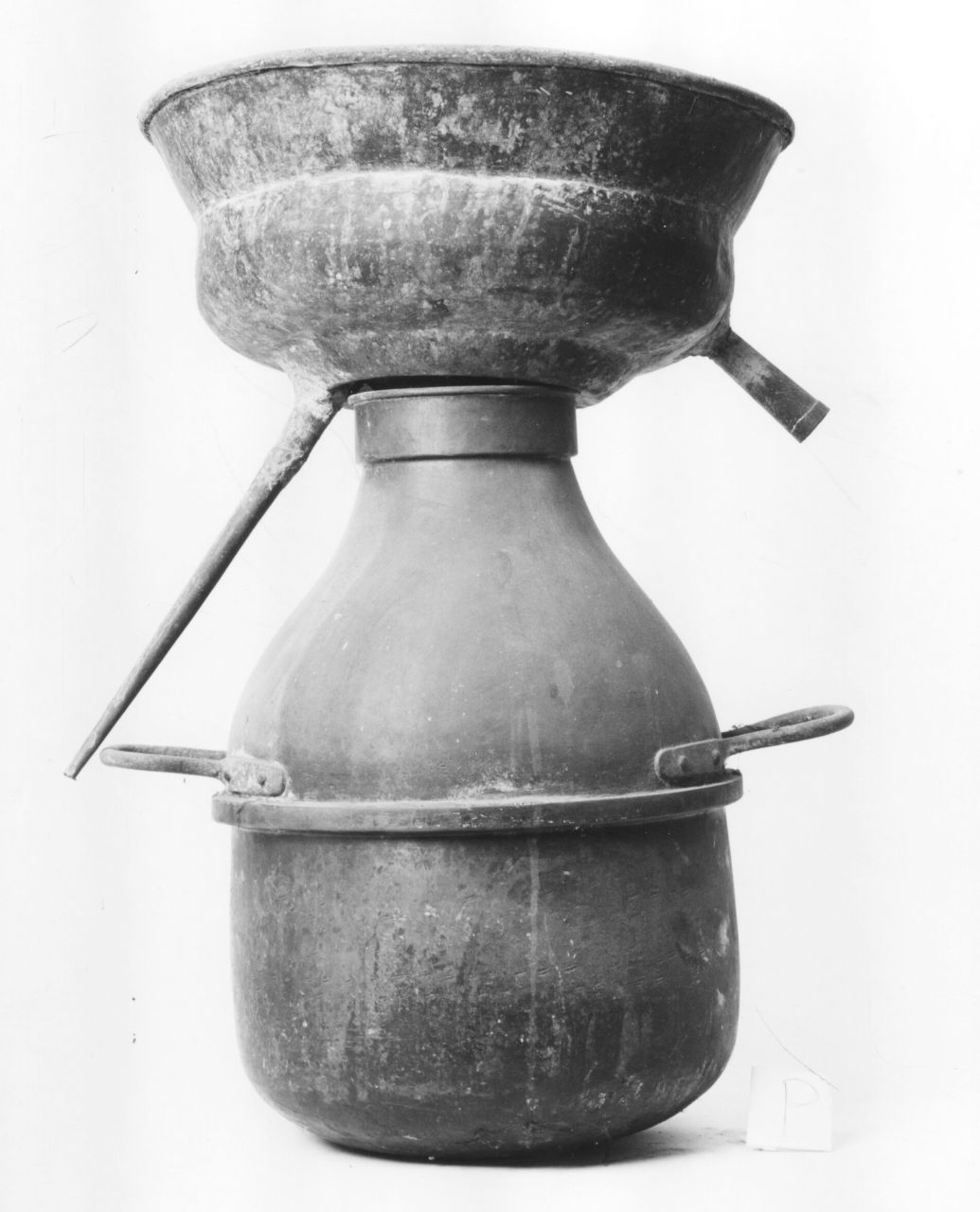 Base circolare. Corpo rotondo con anello aggettante. Spalla bombata. Manici laterali ad anello saldati alla spalla e fermati da chiodi. Collo con fascia in rilievo. Sull'imboccatura del recipiente poggia un contenitore con corpo circolare stondato, versatoio applicato sul corpo e lungo versatoio saldato alla base