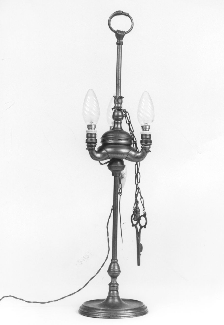Piede a sezione circolare. Fusto con impugnatura sagomata. Coppa a tre becchi. Coperchio a nodi. Tre catenelle a grosse maglie sostenenti smoccolatoio, spegnitoio e attizzatoio
