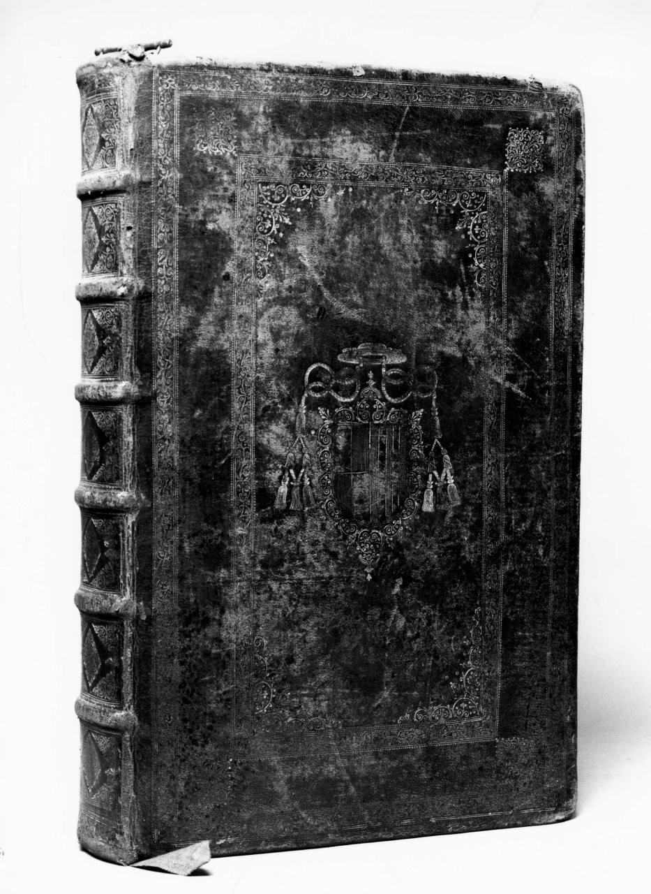 La coperta presenta una ricca decorazione su entrambi i piatti della legatura, su cui compare lo stesso stemma, e sulla costola. Sui piatti della legatura la decorazione si sviluppa come una cornice lungo il bordo esterno ed è ripetuta in dimenzioni minori intorno allo stemma. I motivi decorativi sono costituiti fondamentalmente da tralcio fogliaceo arricchito da fiorellini a girali