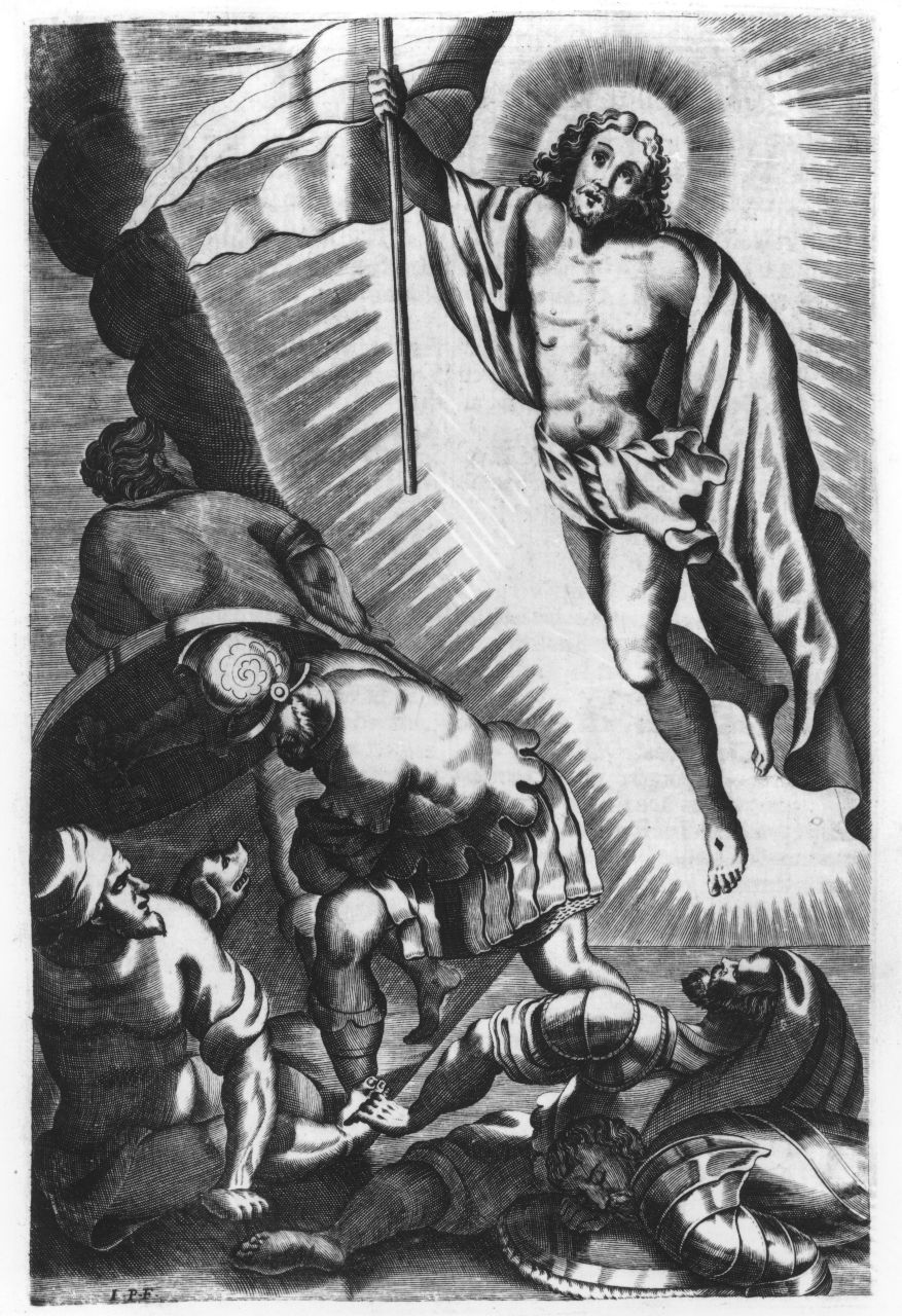 Personaggi: Cristo. Figure: soldati. Simboli: vessillo. Animali: cane. Armi: scudi; corazze; elmo; armatura. Fenomeni divini: luce empirea