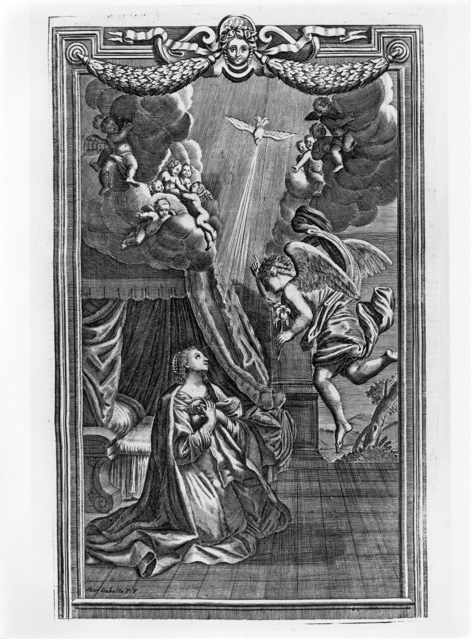 Personaggi: Madonna; San Gabriele Arcangelo. Simboli: colomba dello Spirito Santo. Abbigliamento. Architetture. Paesaggi