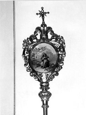 Insegna processionale. Teca ovale circondata da foglie e girali fioriti,cespo sormontato da croce,al vertice. Sul recto S' raffigurata una Annunciazione, sul verso San Roccoseduto, con cane accucciato, chiesa in lontananza e angeli con un cartiglio:eris in peste patronus