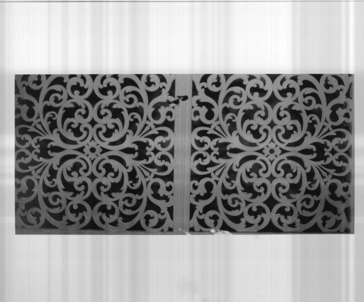 Grata a due ante in legno intagliato e dipinto. L'elegante disegno è dato da quattro volute fitomorfe affrontate, entro cui sono inscritte volute più piccole