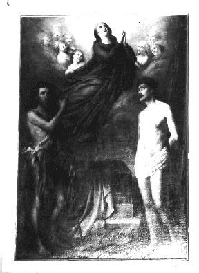 Madonna distesa su nuvole, con veste rossa e manto azzurro, tiene le mani giunte e protese verso l'alto, circondata da angeli. In piedi, ai lati S. Sebastiano, con drappo bianco ai fianchi, S. Giovanni Battista, coperto da pelle di leone