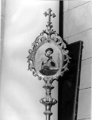 Insegna processionale. Mostra ovale contornata da decorazione di girali e cascatelle fiorite, con croce al vertice. Nel campo interno sul recto: Madonna in gloria d'angeli; sul verso S. Luigi dei Francesi