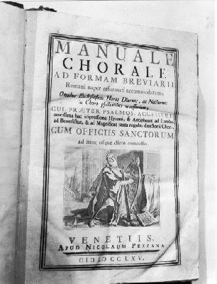 Frontespizio con incisione a fondo pagina raffigurante un re che suona l'arpa con sfondo di colonne e are. Coperta in cuoio marrone con borchie in bronzo