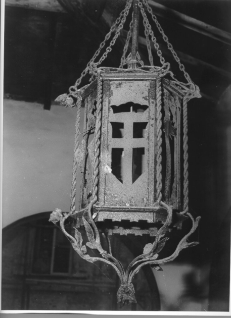 Lampada pensile in ferro battuto. Corpo a prisma esagonale ornato da elementi tortili agli angoli ed simboli araldici a giorno nelle facce. Alla base ornato merlato. In basso e in alto ornati fitomorfi. Otto catene per la sospensione unite ad un sostegno ad asta