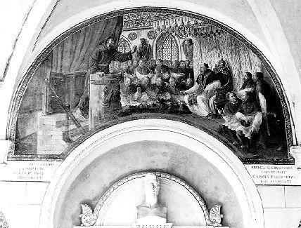 - ISCRIZIONI Sotto la lunetta - DAL PERGAMO FRANCESCO / ANNUNZIATORE/ DELLE VOCI DI DIO CON FORTI ACCENTI /PREDICA AL CONCISTORO E CON STUPORE / L'AMMIRA ONORIO TERZO / E GLI ASSISTENTI.// -