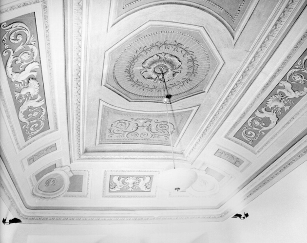 Il dipinto che ricopre la volta, riproduce una struttura architettonica a specchiature,decorate con grottesche e rosoni a finto stucco. Pittura a fresco finito a secco