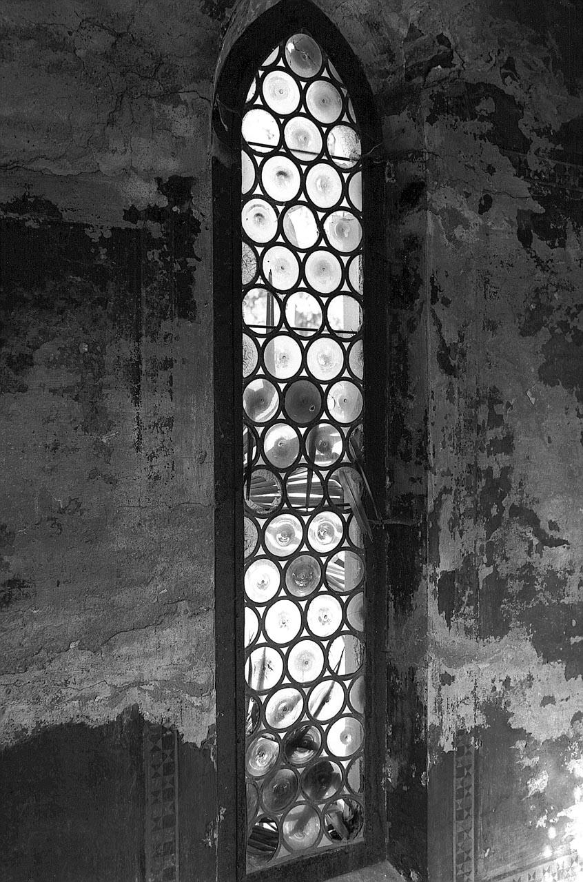 - NOTIZIE STORICO CRITICHE L'armatura della vetrata riprende quella delle vetrate romaniche della prima metà del Duecento anche per l'uso del vetro colorato blù chiaro che si distingue dal cosiddetto "blù di Chartres", di tonalità molto più scura, che venne sempre più usato in epoca gotica. L'opera rientra dunque nel gusto romantico per il recupero di motivi medievali: tale tipo di vetrata esclusivamente basata su motivi ornamentali di carattere geometrico e priva di qualsiasi raffigurazione, ricorda quelle usate nelle chiese cistercensi. L'opera è dunque databile, in consentaneità con la realizzazione della cappella alla quale appartiene, fra il maggio 1880 (anno di morte di Cesare Baldinotti che è assente nei registri di sepoltura del Cimitero) e l'aprile del 1881, quando la cappella fu pubblicata sulla rivista "Ricordi di Architettura"