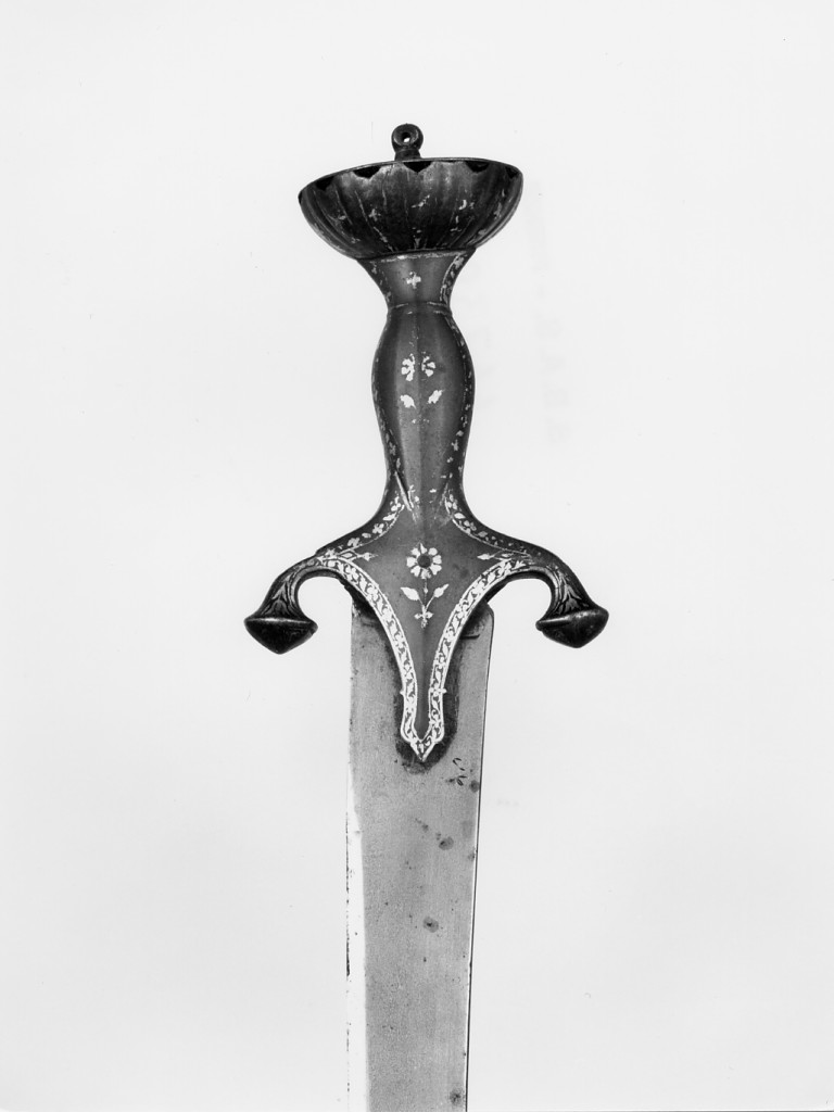 pomo emisferico, bracci ricurvi verso il basso; lama con tallone sodo