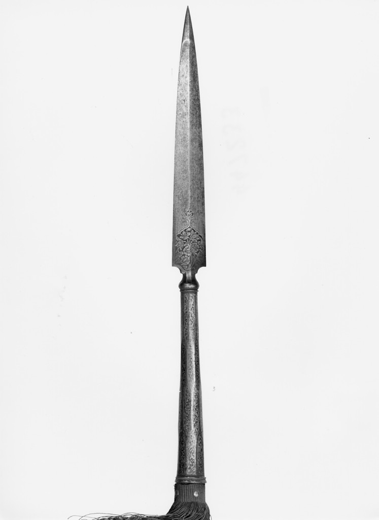 Gorbia a sezione ottagona su quattro ordini sfalsati. Nodo. Cuspide assaipiatta con ornati alla base. Punta rinforzata. Nappa. Asta di legno moderna