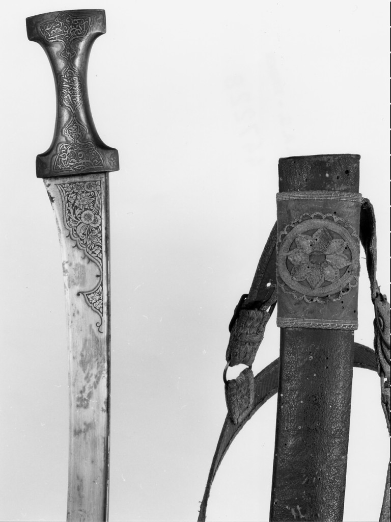 Impugnatura di jambiya e lama di yatagan, il tutto di impronta indo-persiana. Fornimento in argento in due facce saldate seminate di iscrizioni. Lama con profilo del dorso lievemente ricurvo al debole. Dorso a spigoli vivi. Filo in controcurva. Decorazione al forte. Pelle del fodero cucita da filo di rame. Assenza di rinforzi metallici. Cintura con quattro coietti e relative fibbie: due per trattenere il nostro yatagan e due probabilmente per il pugnale. Pelle arancio con lacca nera e verde