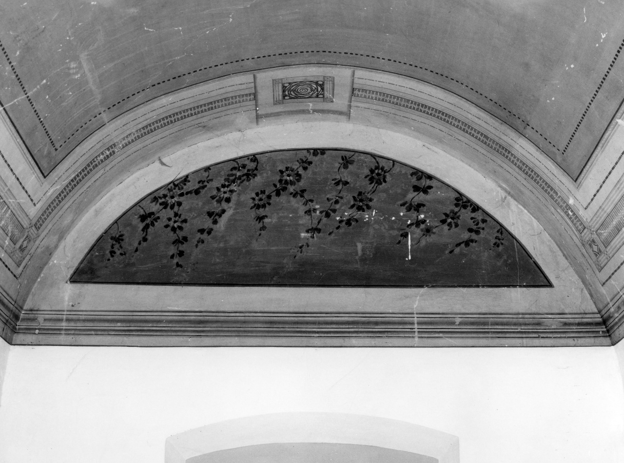 - NOTIZIE STORICO CRITICHE La decorazione dell'ambiente si articola sul soffitto e sul registro super iore di una parete del lato breve con un repertorio di quadrature e di orn ati e, al centro, una ghirlanda di fiori. Databile stilisticamente al prim o quarto del Novecento, la decorazione è opera di pittori e decoratori att ivi in altri ambienti della villa, per i quali le scarse conoscenze del pe riodo non permettono attualmente di individuarne i nomi