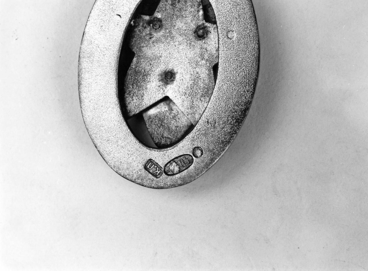 Con scudo crociato sovrapposto a stella a cinque punte. In metallo smaltato di rosso, bianco, verde