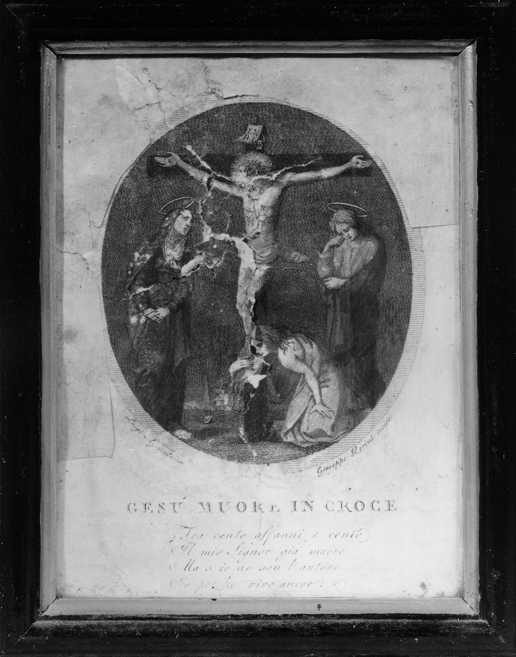 - ISCRIZIONI sotto la stampa - GESÙ MUORE IN CROCE / TRA CENTO AFFANNI, E CENTO / IL MIO SIGNOR GIÀ MUORE / MA S'IO NE SON L'AUTORE / IO PERCHÉ VIVO ANCOR? - corsivo -
