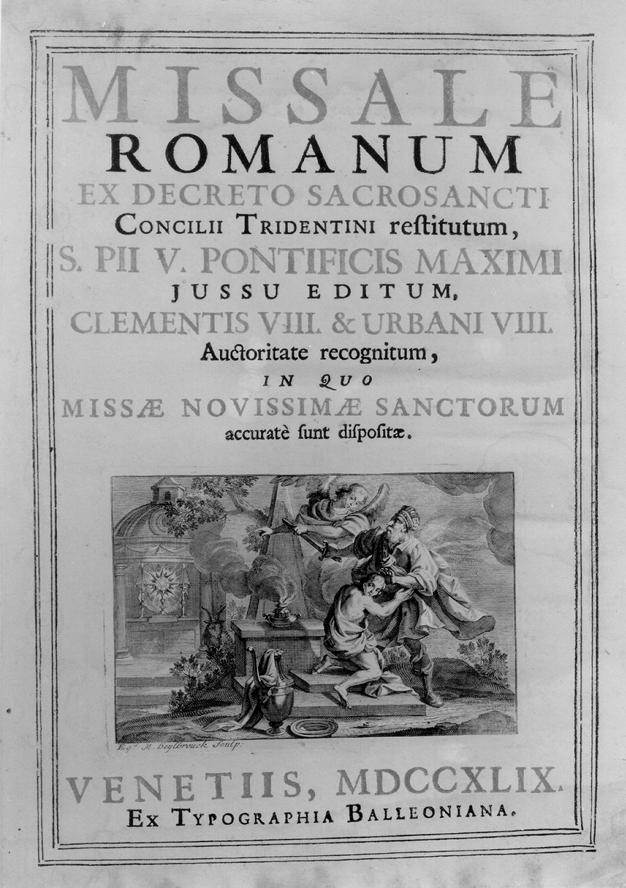 • NOTIZIE STORICO CRITICHE La stampa presenta un'immagine piuttosto articolata di questo soggetto il cui intento è esplicitamente devozionale. Il sacrificio di Isacco, infatti, è associato all'immagine dell'ostia consacrata nell'ostensorio che l'angelo indica ad Abramo nel momento stesso in cui sta per uccidere il figlio. Questo tipo di immagine devozionale è assai comune nella cultura artistica di questo tipo di libro liturgico. L'autore identificato con Michael Heylbrouck è attivo in Italia come incisore nella prima metà del XVIII secolo entro comunque il 1733, suo anno di morte. L'editore-stampatore che pubblicò il messale nel 1749 ha quindi utilizzato vecchie matrici di stampa