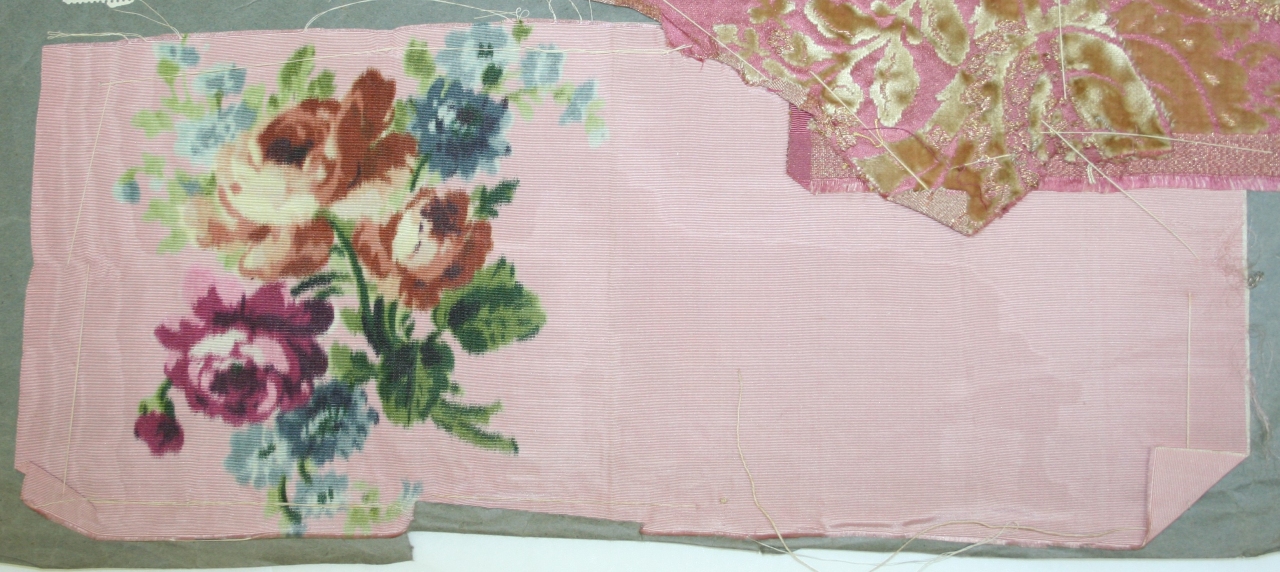 Frammento di tessuto in seta rosa (gros de Tours marezzato) con stampa floreale policroma (chiné à la branche)