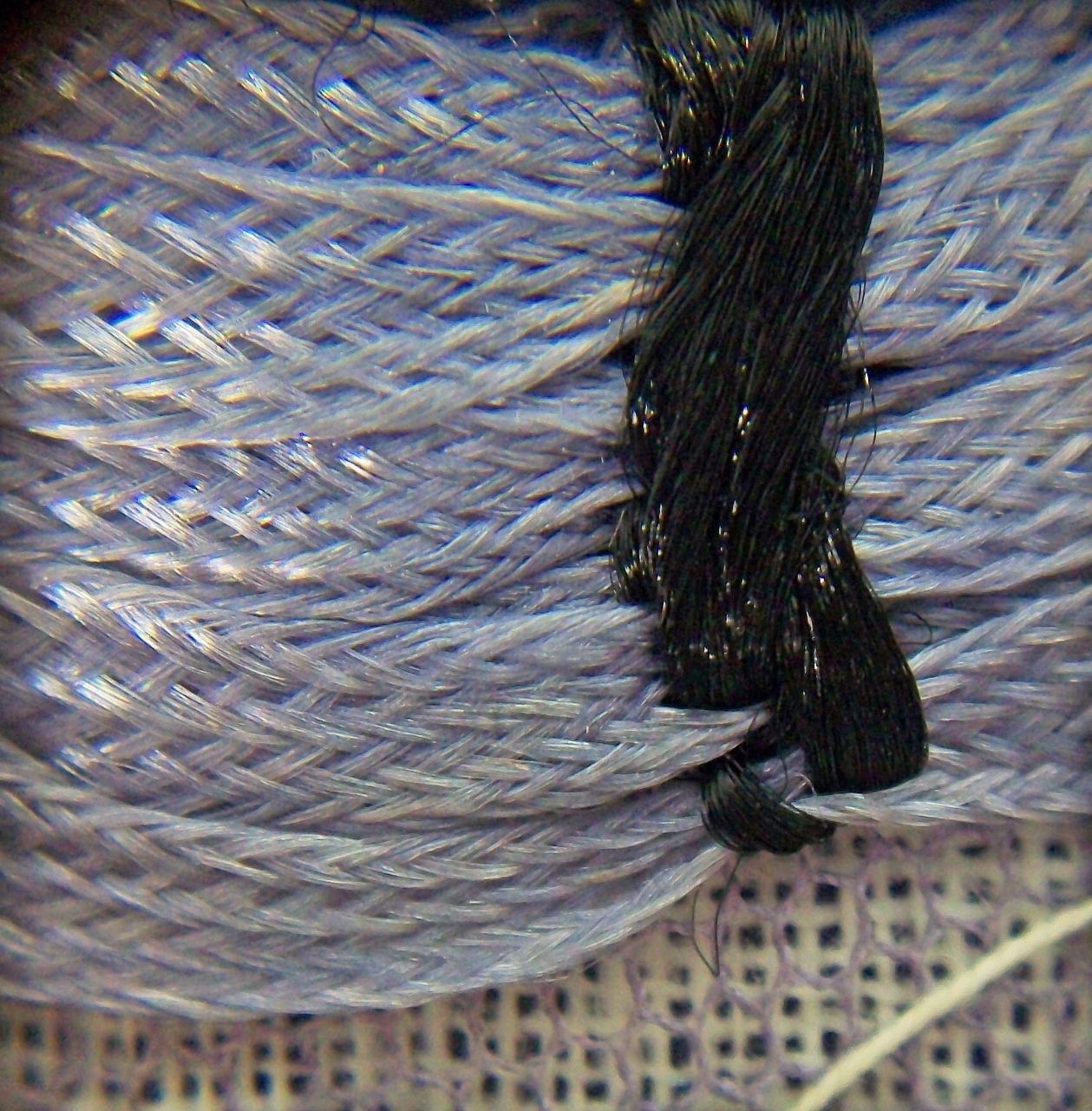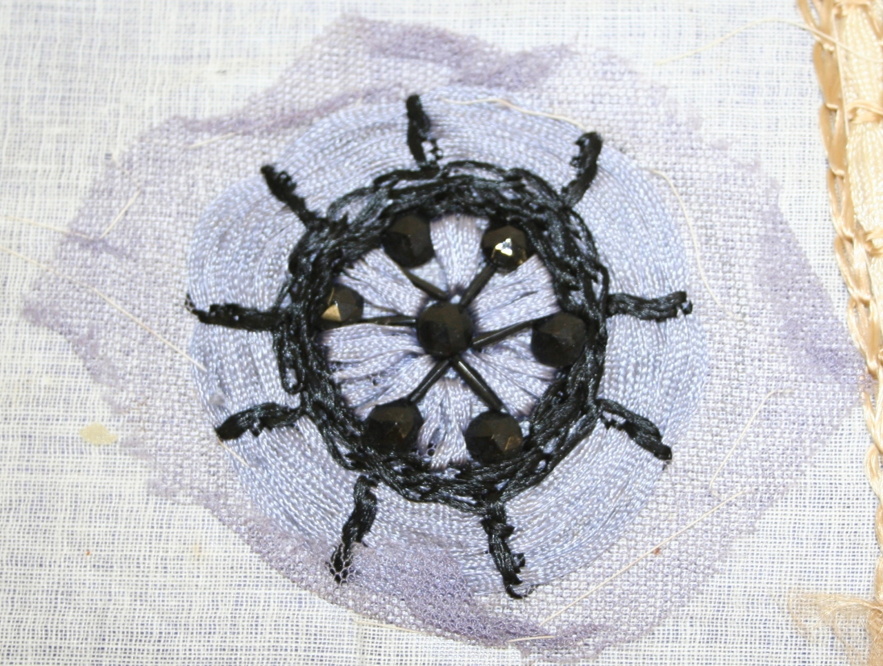Prova di ricamo eseguita su tulle meccanico di seta viola (Bobbinet), mediante applicazione di fettuccia intrecciata di seta in tinta (fissata a punto posato, mediante filato di seta nero non ritorto), e dettagli in filato di seta nera a punto catenella; applicazione di jais sfaccettati e cannucce di colore nero. Motivo di piccolo rapporto con rosone raggiato