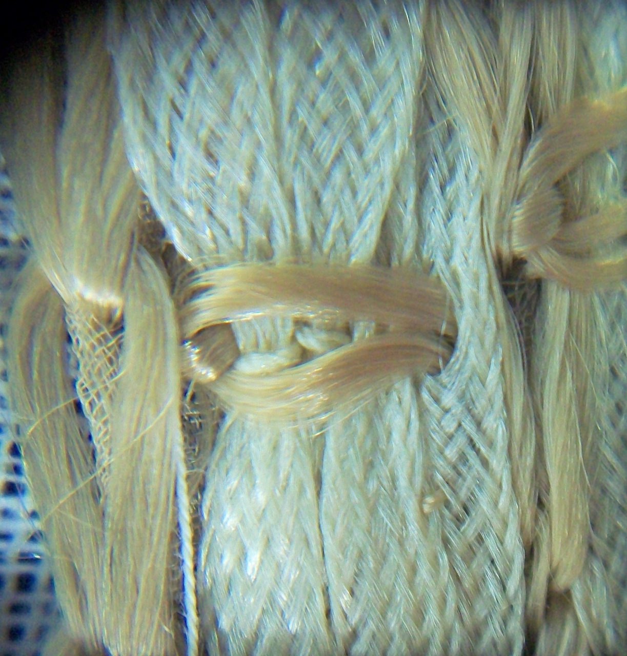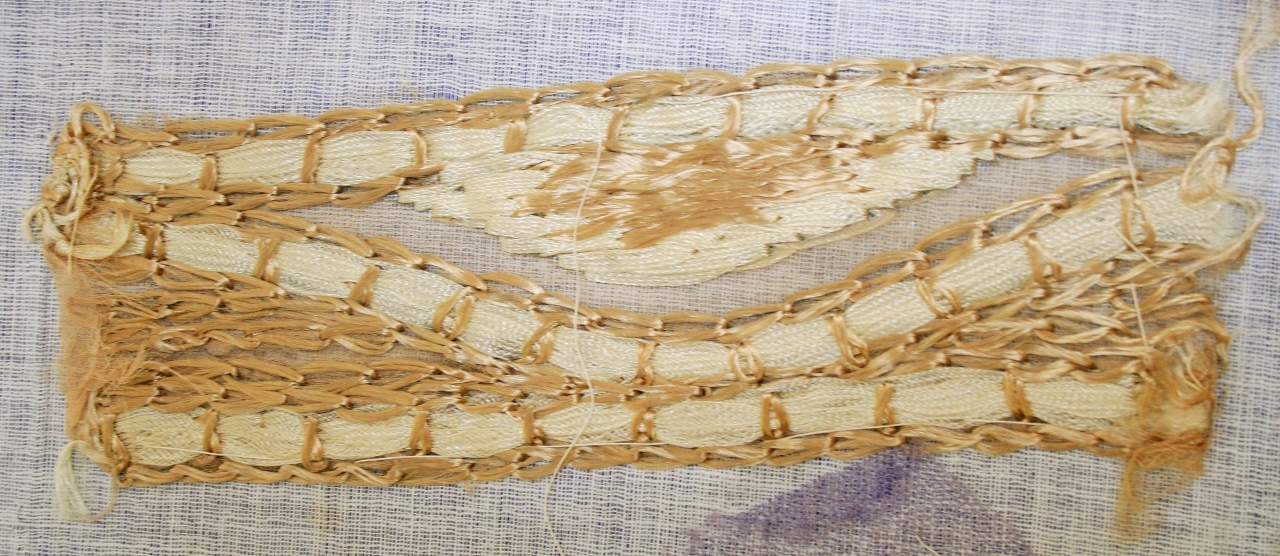 Prova di ricamo (bordo) con motivi geometrici e festone continuo a sviluppo ondulato, realizzato su chiffon di seta avorio, in filato di seta beige non ritorto e fettuccia intrecciata di seta color avorio (punti posato, raso, catenella)
