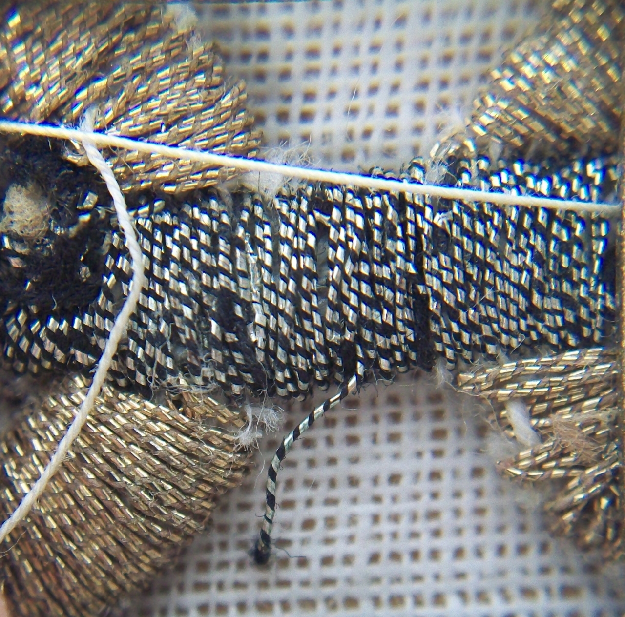 Guarnizione a ricamo meccanica (macchina da ricamo manuale), in forma di catena con maglie alternate in oro riant (su anima écru) e argento riant (su anima nera)