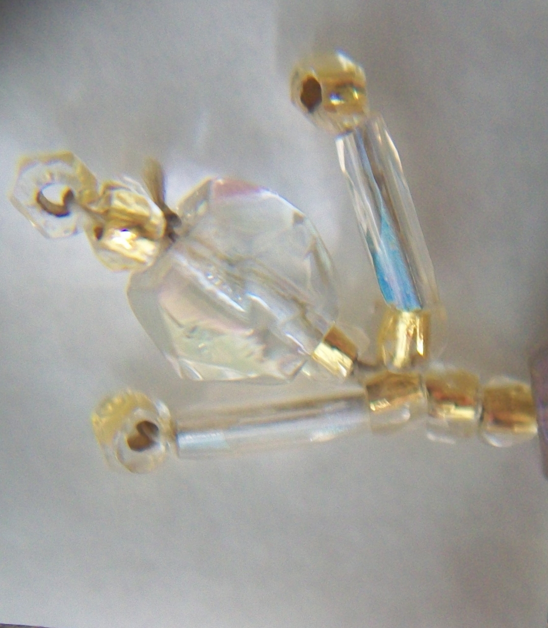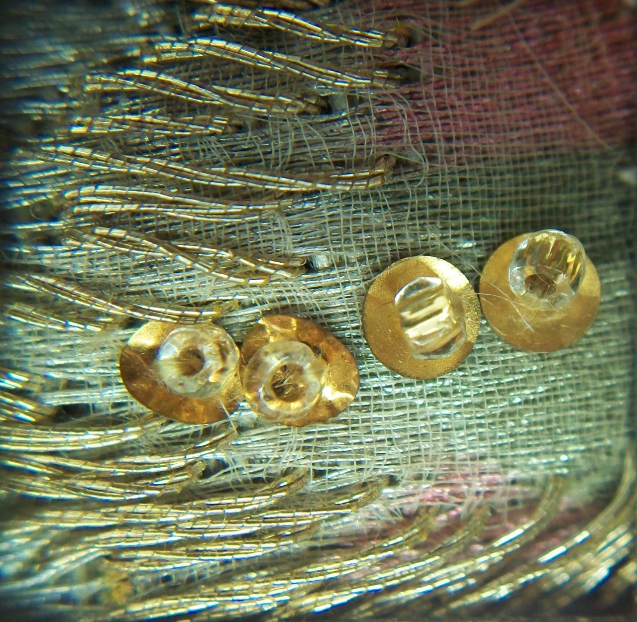 Nastro (bordo) ad armatura raso, con orditi in seta avorio e trama in argento filato, stampato a motivo di tralcio con rose policromo; lungo il bordo superiore, fila di paillettes metalliche dorate, sormontate da perline sfaccettate, con film dorato all'interno, alternate a perle iridescenti sfaccettate; lungo il bordo inferiore, pendenti a mo' di frangia, costituiti da perline trasparenti con film dorato interno, perle sfaccettate iridescenti e cannucce vitree iridescenti, con film argentato all'interno. Dettagli a ricamo, in oro filato (tre capi, punto passato); nervature con file di paillettes dorate, sormontate da perline con film dorato, su strato di chiffon tinta avorio. In corrispondenza dell'infiorescenza centrale, applicazione di petali tridimensionali in chiffon rosa e perle vitree satinate rosate (parzialmente perdute)