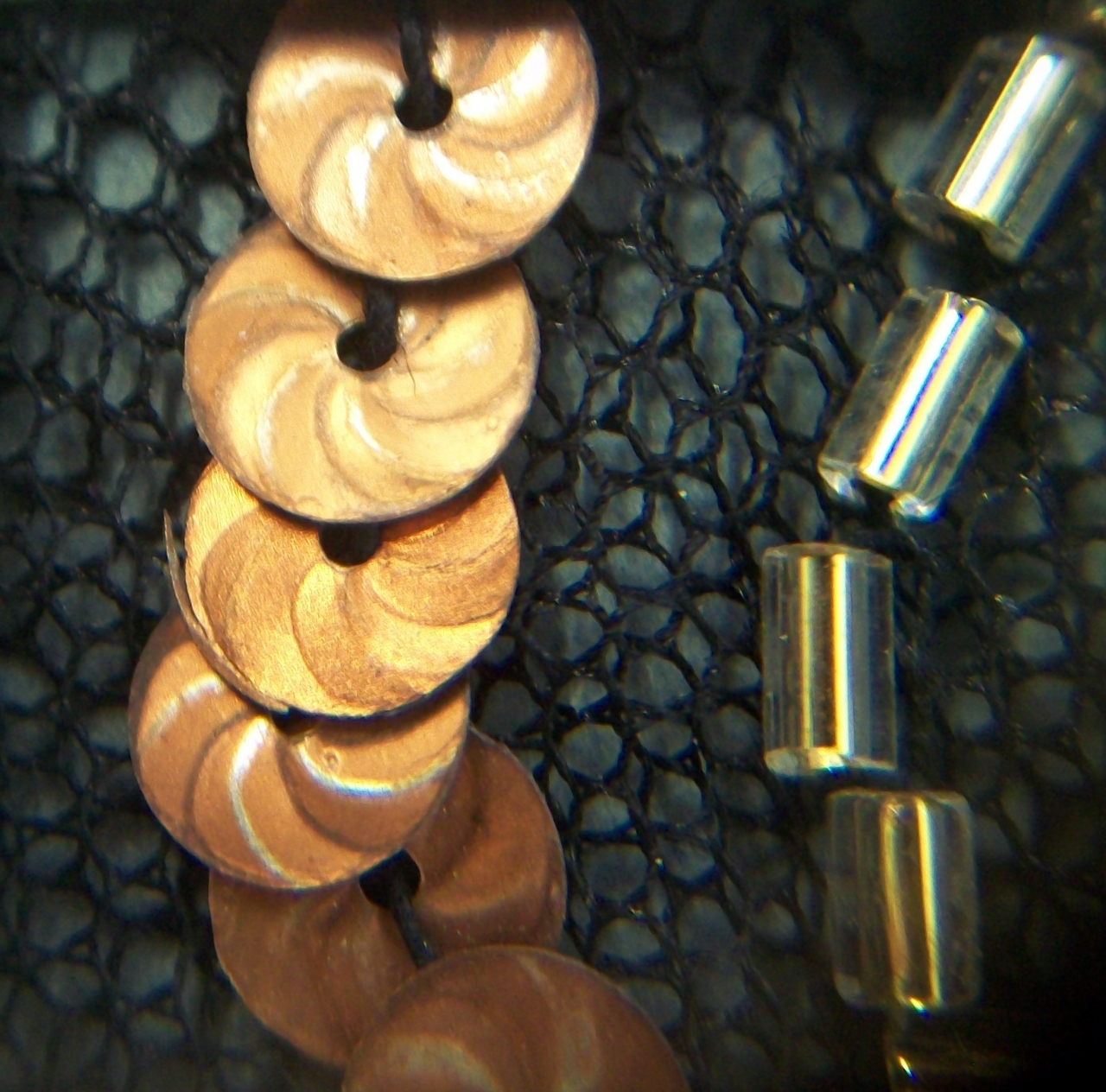 Studi per ricamo, eseguiti su tulle meccanico (Bobbinet) di seta nero. Da sinistra verso destra: borchie metalliche dorate a forma di fiore, disposte a scacchiera, sormontate da perline vitree con film dorato all'interno, accompagnate da cannucce nel medesimo materiale (tre cannucce per borchia); decoro a vermicelles costituito da file di perline cilindriche in vetro con film dorato all'interno, e profilatura a festoni con fila di paillettes in gelatina di bue, rivestite da patina color rame ad effetto spirale; lungo il festone, piccoli fiori tridimensionali con petali in paillettes di rame sfaccettate, accompagnati da cannucce vitree con film dorato all'interno (tre cannucce per fiore); decorazione ad effetto vermicelles con applicazione di cannucce vitree con film dorato all'interno, di diverso formato