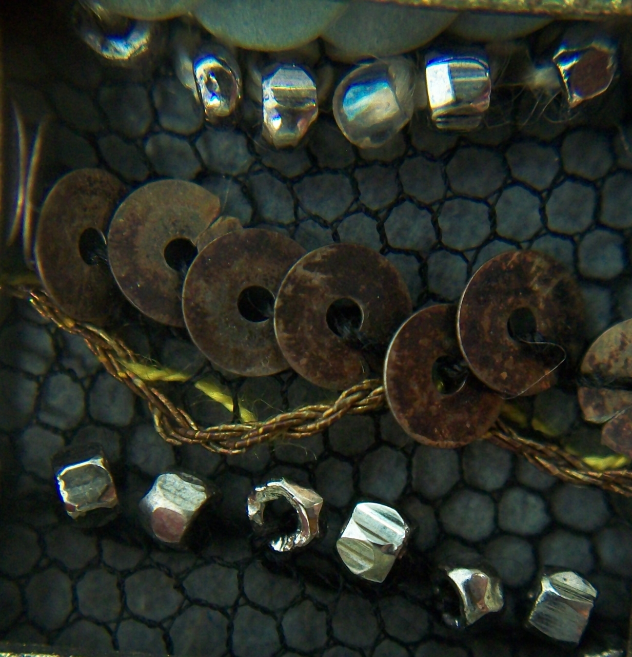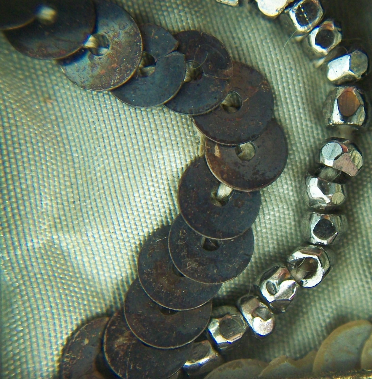 Ricamo in applicazione, eseguito su tulle meccanico (Bobbinet) di seta nero, mediante riporto di tasselli, opportunamente sagomati, in taffetas di seta verde chiaro e velluto nero (in seta e cotone). Alcune parti, risultano ancora rivestite da strato di carta oleata. Motivo a rosone centrale con quadrifoglio, attorniato da elementi geometrici quadrilobati disposti a croce. Profilature in marcassiti sfaccettati, paillettes d'argento e in gelatina di bue verde chiaro (di formato maggiore), fissate a punto indietro e punto posato. Dettagli in filato di seta ritorto, nei colori giallo paglierino e verde chiaro (punto piatto). Per il rosone centrale, profilature con paillettes argentate e torciglione in oro riant (torsione S), su anima gialla e verde chiaro